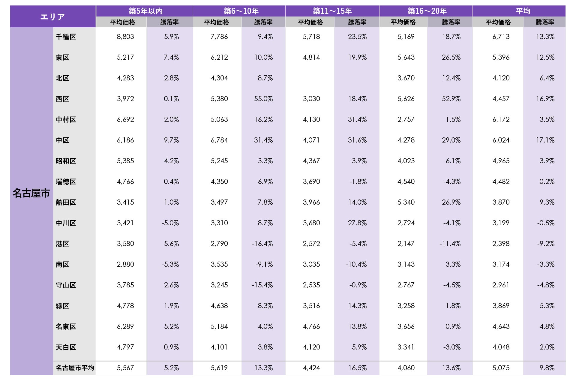 名古屋市では、平均価格が最も高かった千種区の平均価格が6,713万円で、中村区、中区も6,000万円を上回りました。平均騰落率が最も高かったのは中区で新築分譲時プラス17.1%となりました。名古屋市では、平均騰落率がプラス10%を超えたのは千種区、東区、西区、中区の4区、その他は8区がプラス1ケタ台、4区がマイナスとなりましたが、前期と比べると価格は若干上昇傾向にあります。築年数別で最も平均騰落率が高かったのは、西区の築6~10年でプラス55.0%(新築時価格の約1.6倍)でした。
