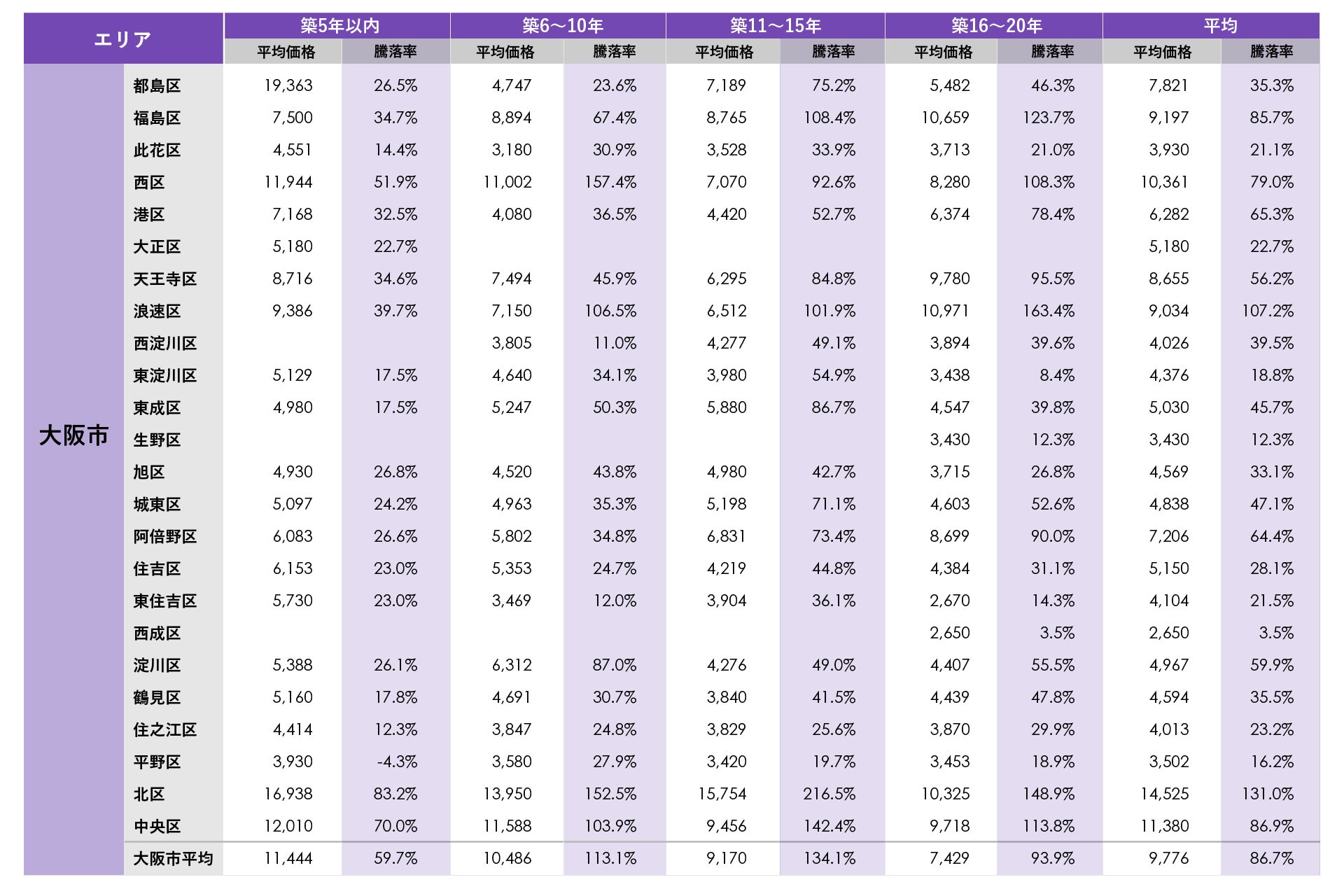 大阪市で平均価格が最も高かったのは北区の1億4,525万円、次いで中央区の1億1,380万円、西区が1億361万円で、この2区の平均価格が1億円を上回りました。平均騰落率も北区が新築分譲時プラス131.0%で最も高く、次いで浪速区が107.2%となり、この2区の平均騰落率がプラス100%(新築時価格の2倍)を超えました。築年別の平均騰落率では、福島区の築11~15年、築16~20年、西区の築6~10年、築16~20年、浪速区の築6~10年、築11~15年、築16~20年、北区の築6~10年、築11~15年、築16~20年、中央区の築6~10年、築11~15年、築16~20年で平均騰落率がプラス100%(新築時価格の2倍)を上回りました。梅田から難波あたりのエリアで騰落率200%(新築時価格の3倍)を上回るタワーマンションの中古流通が相次ぎ、市場をけん引しています。