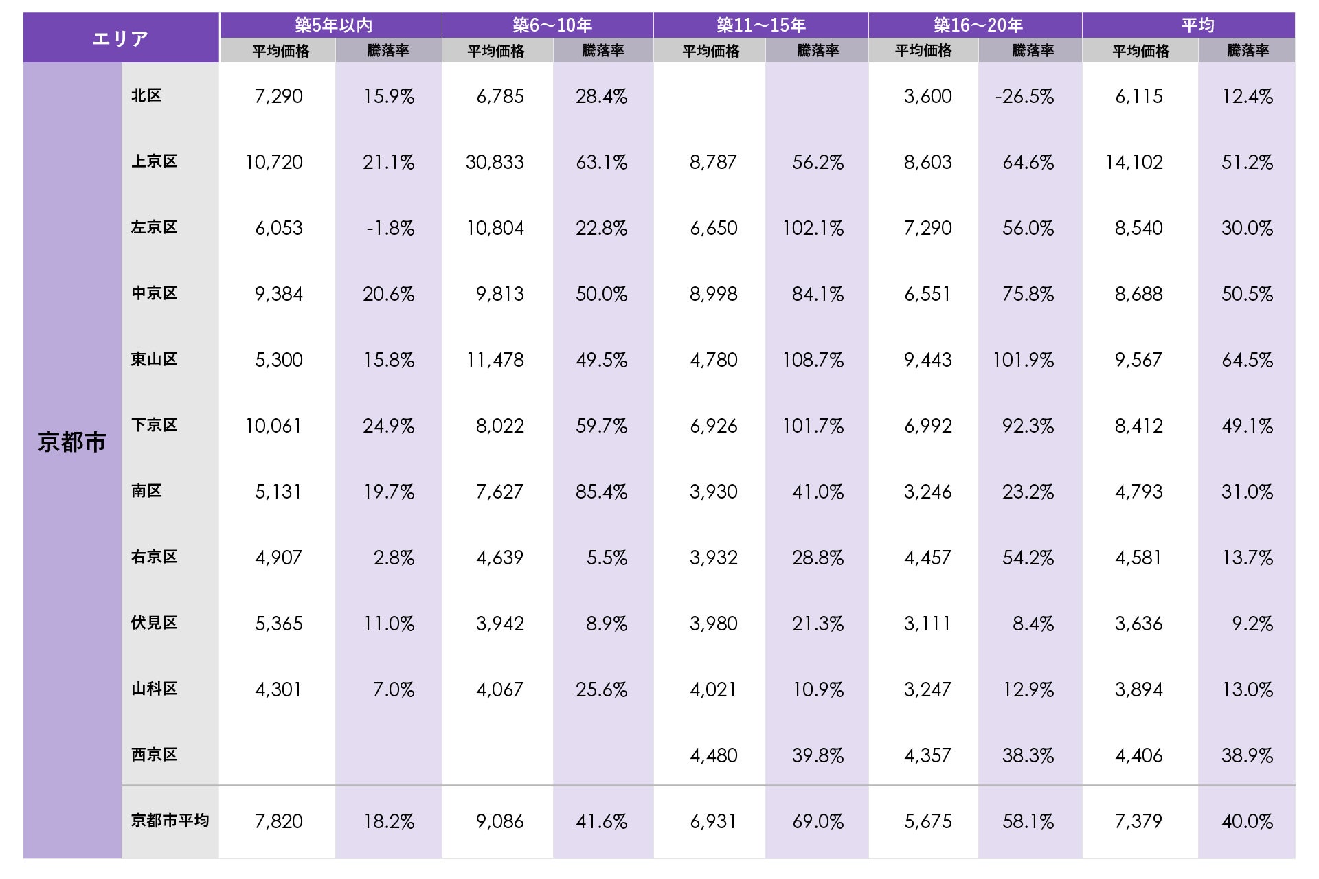 京都市で平均価格が最も高かったのは東山区の1億4,102万円で、市内で唯一平均価格が1億円を上回りました。平均騰落率が最も高かったのは東山区の新築分譲時プラス64.5%で最も高く、上位エリアでも50%(新築時価格の1.5倍)前後の騰落率となりました。築年数別では左京区の築11~15年、東山区の築11~15年、築16~20年、下京区の築11~15年で平均騰落率がプラス100%(新築時価格の2倍)を上回りました。2000年代前半に京都市役所周辺エリアで新築分譲された物件の中古流通価格が大きく上昇し騰落率をけん引しています。