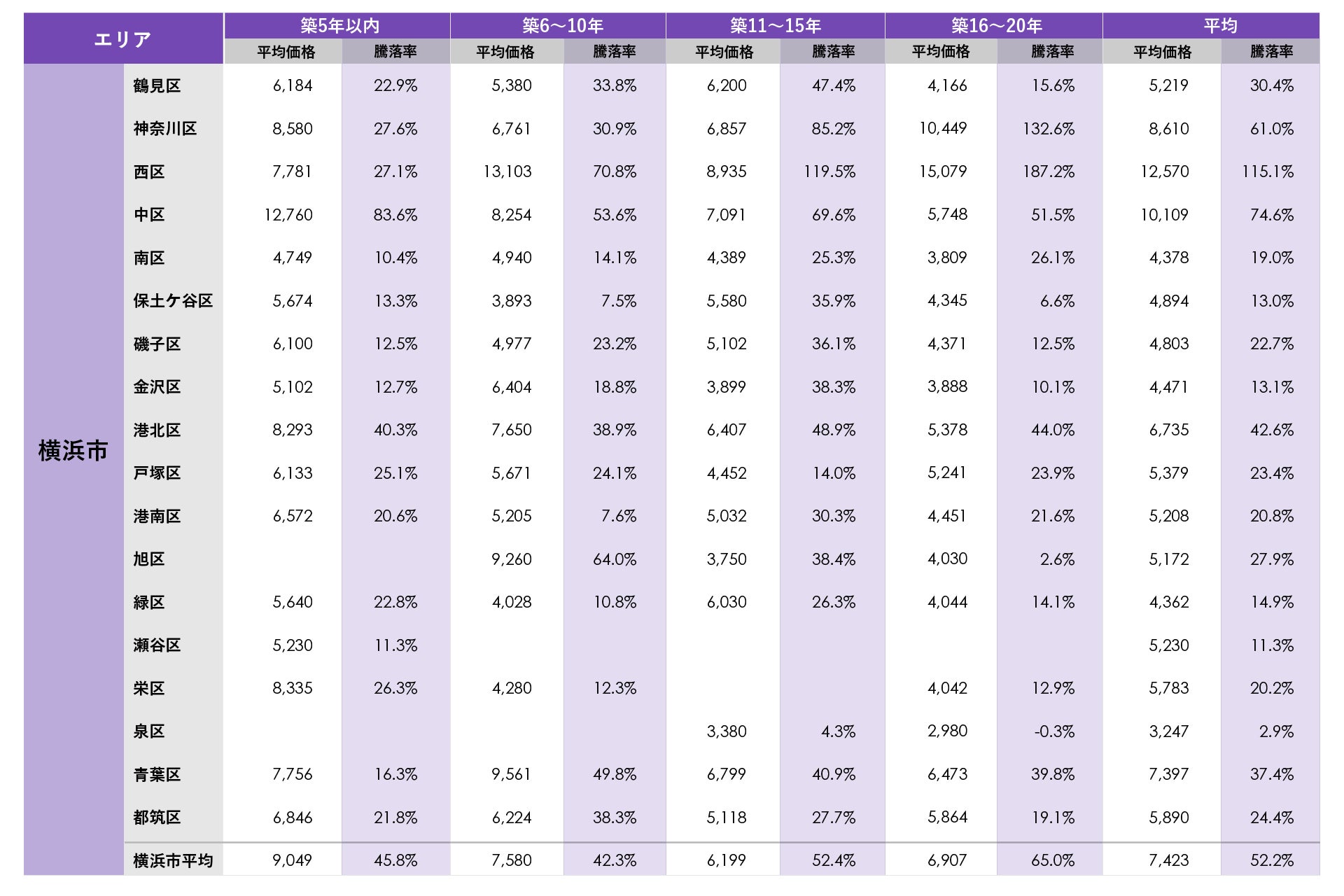 横浜市では、西区と中区の平均価格が1億円を上回りました。平均騰落率は西区が最も高く突出しており新築分譲時プラス115.1%(新築時価格の約2.2倍)、次いで中区がプラス74.6%、神奈川区がプラス61.0%でした。築年数別では神奈川区の築16~20年、西区の築6~10年、築16~20年、中区の築5年以内で平均価格が1億円を上回りました。築年数別の平均騰落率では西区の築16~20年のプラス187.2%(新築時価格の約2.9倍)が最も高く、その他西区の築11~15年、神奈川区の築16~20年で平均騰落率がプラス100%(新築時価格の2倍)を超えました。横浜駅近のタワーマンションで新築分譲時価格の3~4倍の価格で中古流通したことなど、沿岸部のタワーマンションの中古流通価格が相場をけん引しています。