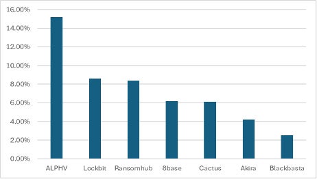 グループごとの差異はその大半が些細なものです。しかし、例外もあります。BlackCat(ALPHV)は、協力者に対して、特に病院や医療機関に焦点を当てるよう公に奨励してきました。これは、警察当局がこのグループのインフラに対して行った作戦への報復とされています。その結果、過去12カ月間で、ランサムウェアの被害者全体に占める医療業界の割合は15%以上に達しました。