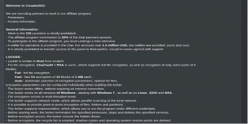実例として、“Cicada3301”というニックネームのハッカーが、ロシア語の非公開のアンダーグラウンドフォーラム上に、RaaSを提供する新チームの発足を告知する広告を投稿したケースがあります。見返りとして要求したのは、攻撃が成功した場合の手数料20%だけでした。これは、RaaSを提供するサイバー犯罪者が協力者を募る方法と、一般的な収益配分の内訳を示す一例です。注目すべき点として、一部のフォーラムでは、当事者間で報酬の支払いやサービス提供に関する見解の相違が生じた場合に対応するため、調停および紛争解決のための体制が整えられています。このような仕組みは、匿名の環境下でコミュニケーションを取る犯罪者同士にとって不可欠な要素となっています。
