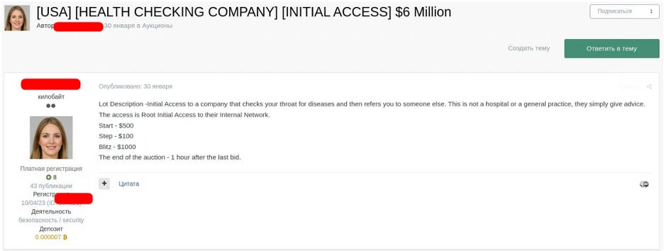 ランサムウェアグループは、暗号化ツールやインフラを協力者に提供し、盗まれた機密データは多くの場合、被害者に支払いを迫るためにネット上に公開されます。加えて、ハッカーたちはアンダーグラウンドフォーラムで病院のシステムへのアクセス権を売買しています。中には仲介役として、初期のアクセス権を購入し、権限に関する不正利用を評価後ネットワークの構成を調査した上で、そのアクセス権を他者に転売する者もいます。例えば、2024年1月以降、アンダーグラウンドフォーラムで活動しているロシア語圏のサイバー犯罪者とみられる人物は、ブラジルの病院へのアクセスを250ドルで販売していました。この人物は、年間収益5500万ドル規模の医療機関を標的とし、アクセス権を売った後さらなる攻撃を仕掛けていました。