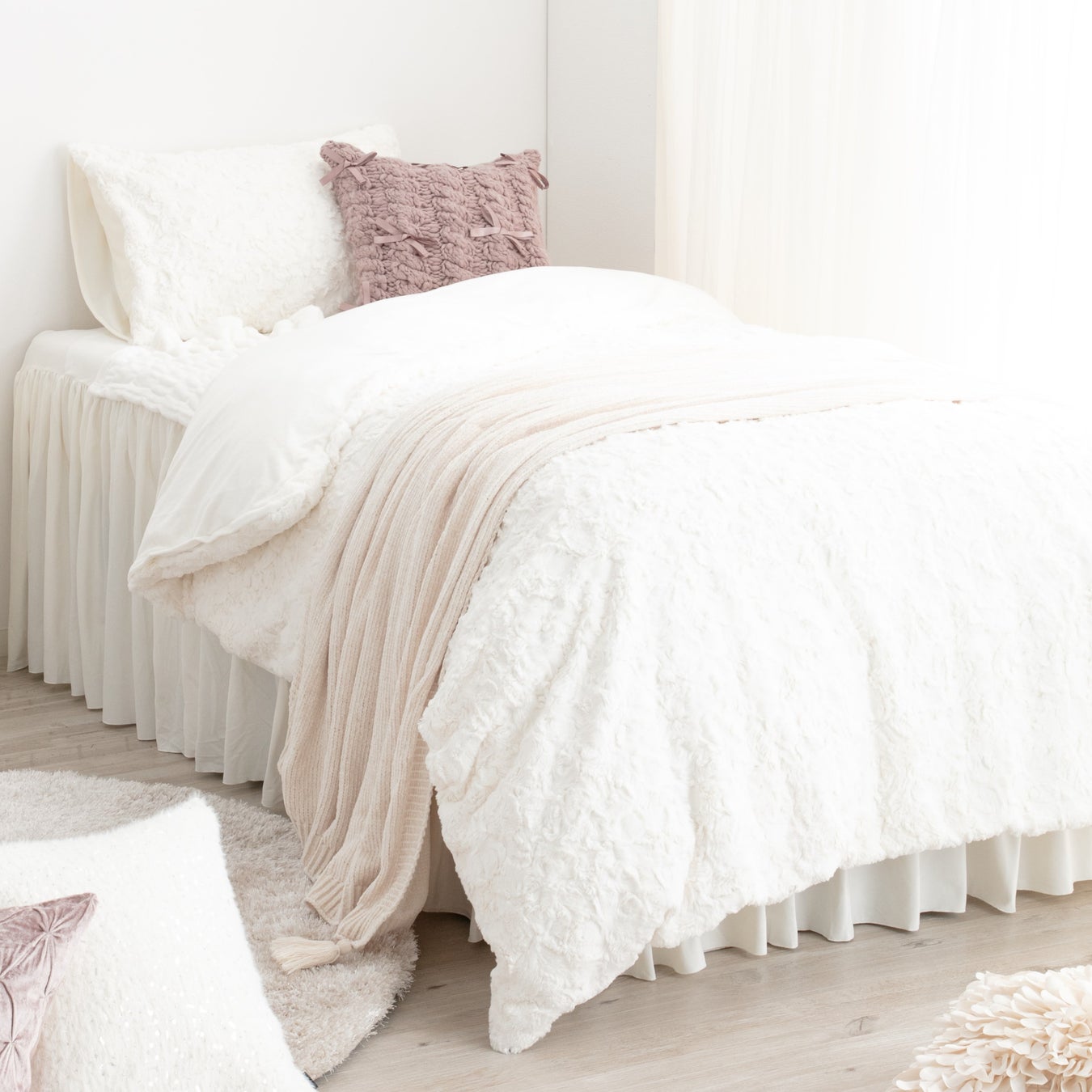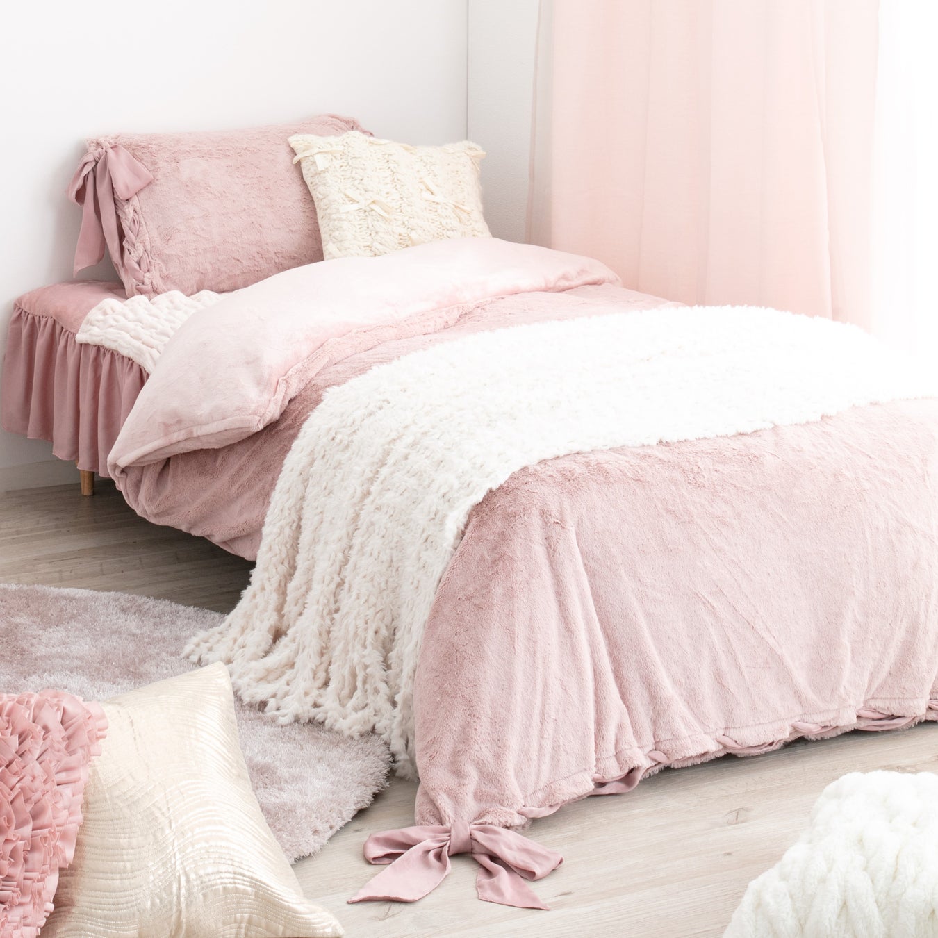 ファー生地を使用したふわふわ感とサテンで編み上げたリボンのデザインがかわいい寝具シリーズです。足元の裾にさりげなくリボンが施されているので、甘くなりすぎず大人かわいい雰囲気を演出し、ベッドルームをぱっと明るく華やかにしてくれます。ふんわりと柔らかい毛足で布団に入った時のヒヤっと感が少なく、快適な入眠をサポートしてくれます。