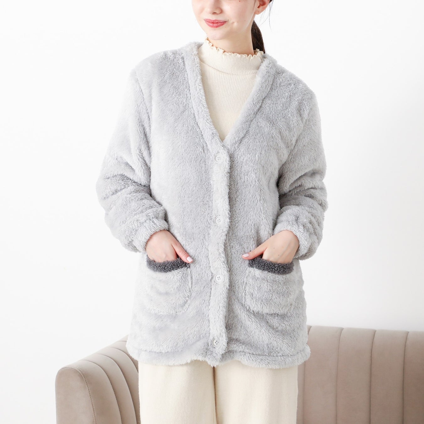 手触りが心地よいフリース生地のカーディガンです。毛足が長いので、身体を暖かく包み込んでくれます。ヒップまで隠れる長めの丈で、腰回りもしっかりカバーしてくれるサイズ感です。袖にゴムを通しているので、袖まくりしても落ちにくいのも嬉しいポイント。洗い物などの家事や、作業をする時もストレスフリーに着用することができます。ポケットにくるっと収納すればクッションとしてもお使いいただけます。
