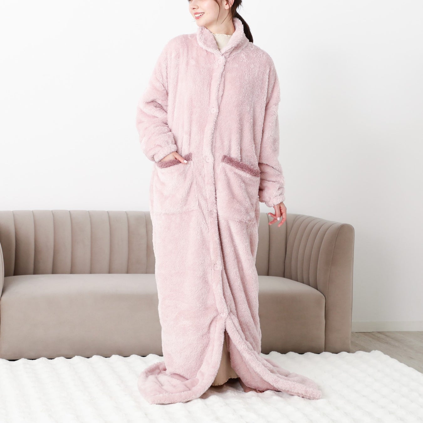 手触りが心地よいフリース生地のロングブランケットローブです。着丈160cmで足ポケットが付いているので冷えやすい足先まで暖かく包み込んでくれます。柔らかな繊維を起毛させているのでふわふわの肌触りが気持ちよく、軽い着心地なので長時間着ていても疲れにくいためおうち時間に最適です。袖にゴムを通しているので、袖まくりしても落ちにくいのが嬉しいポイントです。