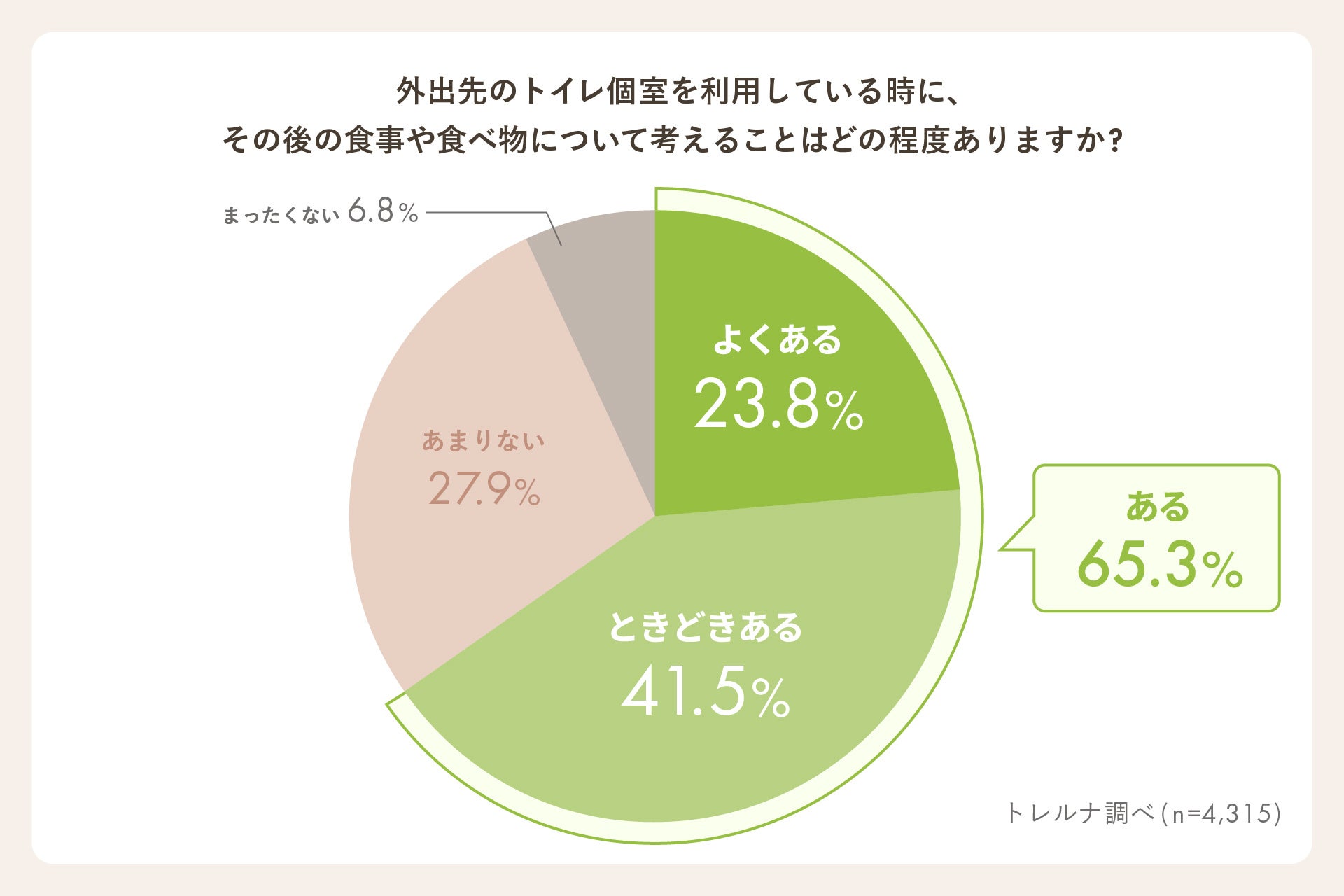 外出先トイレ個室で食事や食べ物について考えることが「よくある」「ときどきある」と回答した人は65.3%。食事内容や店選びなど、食に関する検討や選択を行う時間になっている