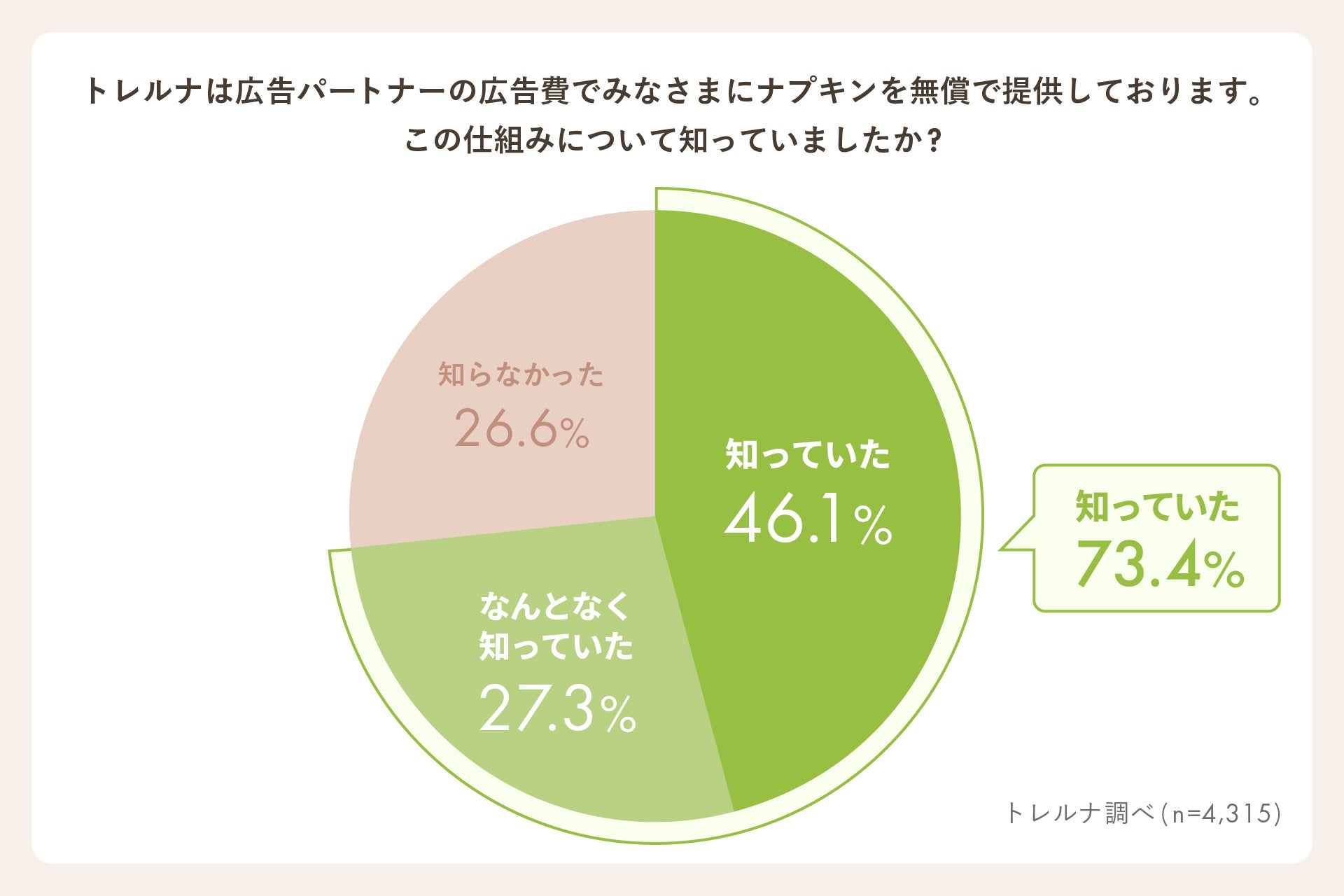 最後に、トレルナが、広告パートナーの出稿によって生理用ナプキンの無償提供を実現している仕組みについて伺うと、「知っていた」46.1%、「なんとなく知っていた」27.3%と、73.4%が認知していることがわかりました。