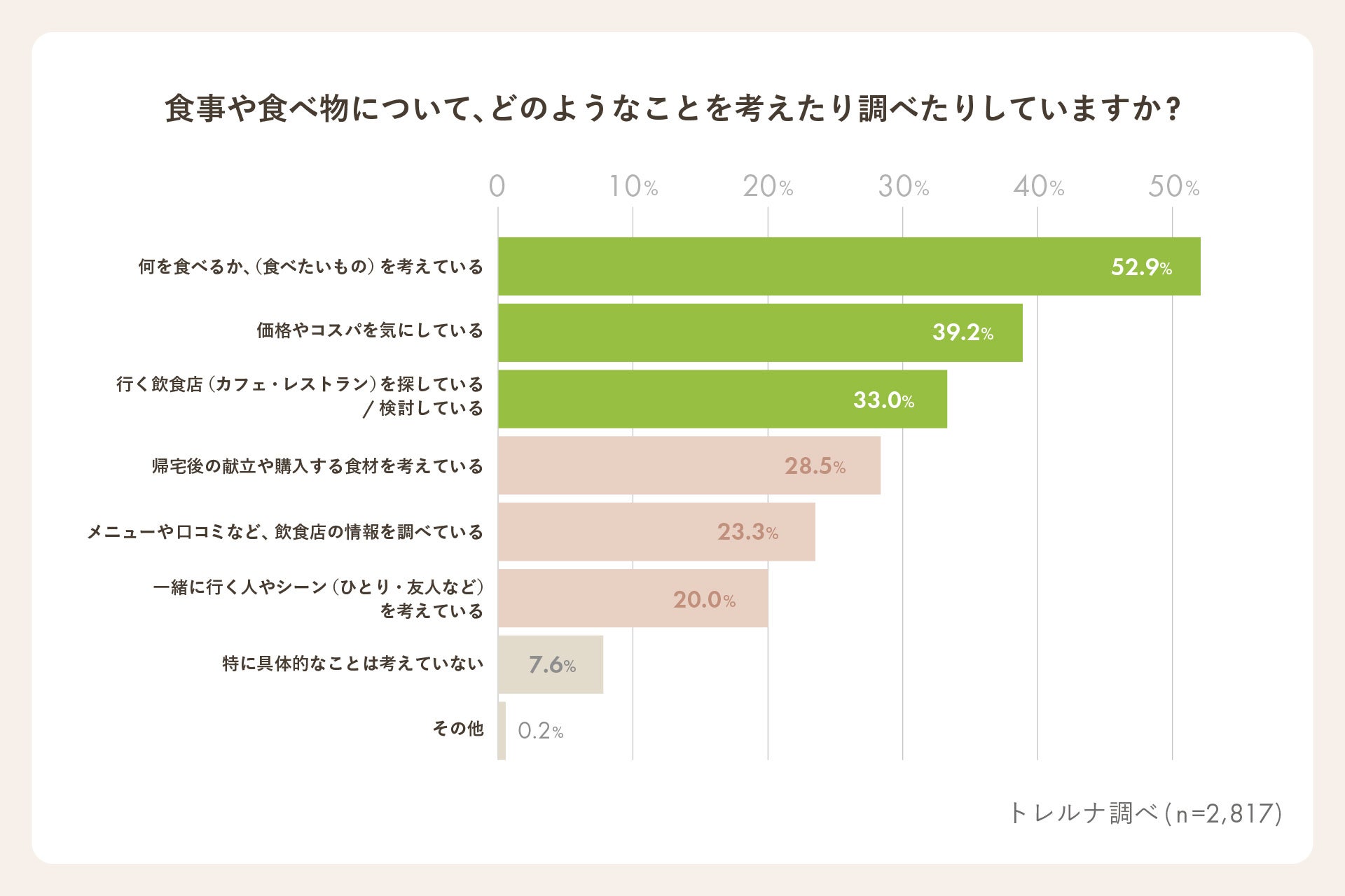 さらに具体的にどんなことを考えたり調べたりしているかを伺ったところ、「何を食べるか考えている」52.9%、「価格やコスパを気にしている」39.2%、「飲食店を探している」33.0%など、具体的な購買・来店に直結する思考が多く見られました。これらの結果から、トイレ個室は「食」に関する検討や選択を考える時間の一つとなっていることがわかりました。
