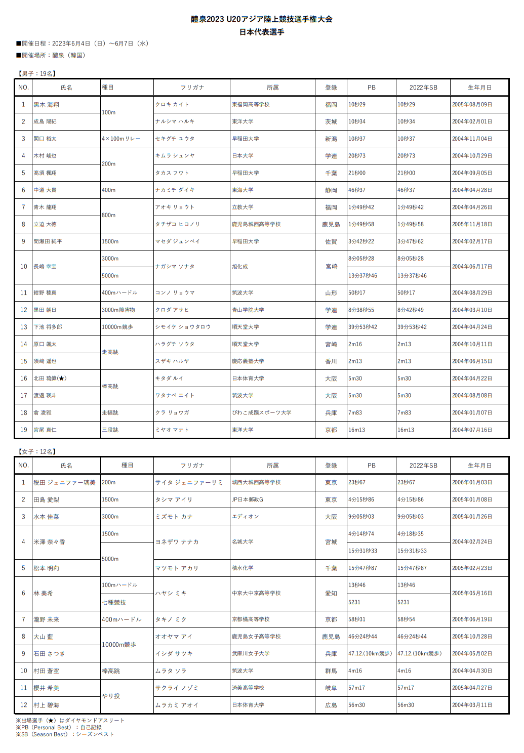 ▼醴泉2023 U20アジア陸上競技選手権大会 日本代表選手要項