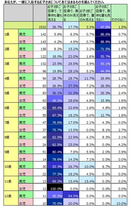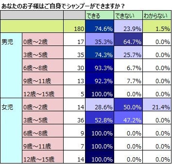 6歳以上で、男女ともに9割以上の子どもがひとりでシャンプーができている。