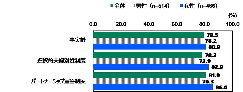 事実婚 79.5% 選択的夫婦別姓制度 78.3% パートナーシップ宣誓制度 81.0%