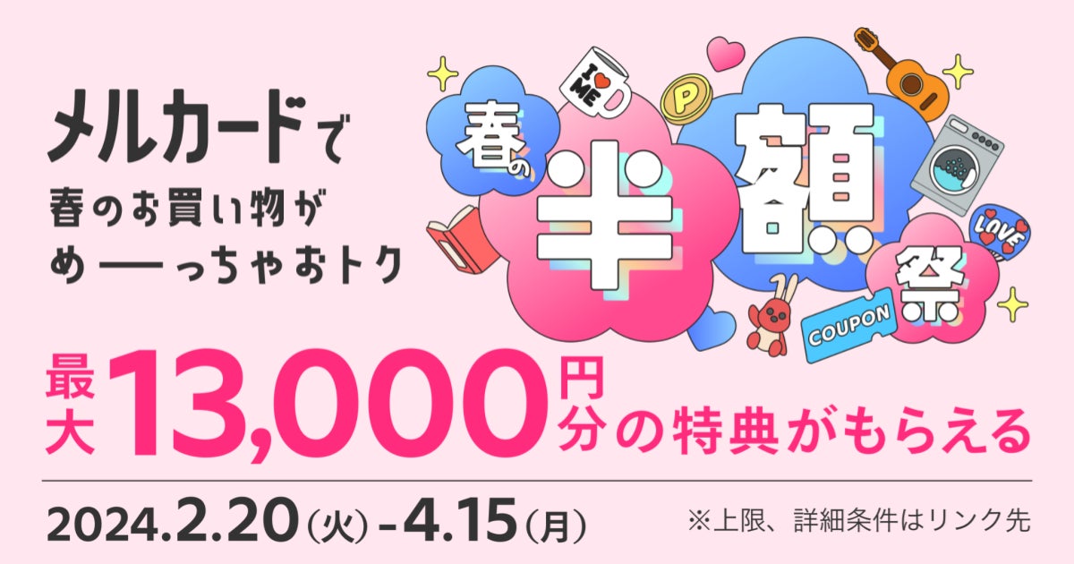 株式会社メルペイ(以下、メルペイ)は、2024年2月20日から4月15日の期間中、メルカードに初めて入会(メルカードの申し込みを完了し、審査を通過すること)・利用されたお客さまを対象に、最大で13,000円分の特典がもらえるキャンペーン「春の半額祭」(※1)を開催します。さらに、新生活1年目を応援するために18歳から25歳までの方は、メルカリで売れた時に発生する販売手数料の実質半額クーポン(上限P500)を月3枚×11ヶ月分もらえる限定特典も提供します。