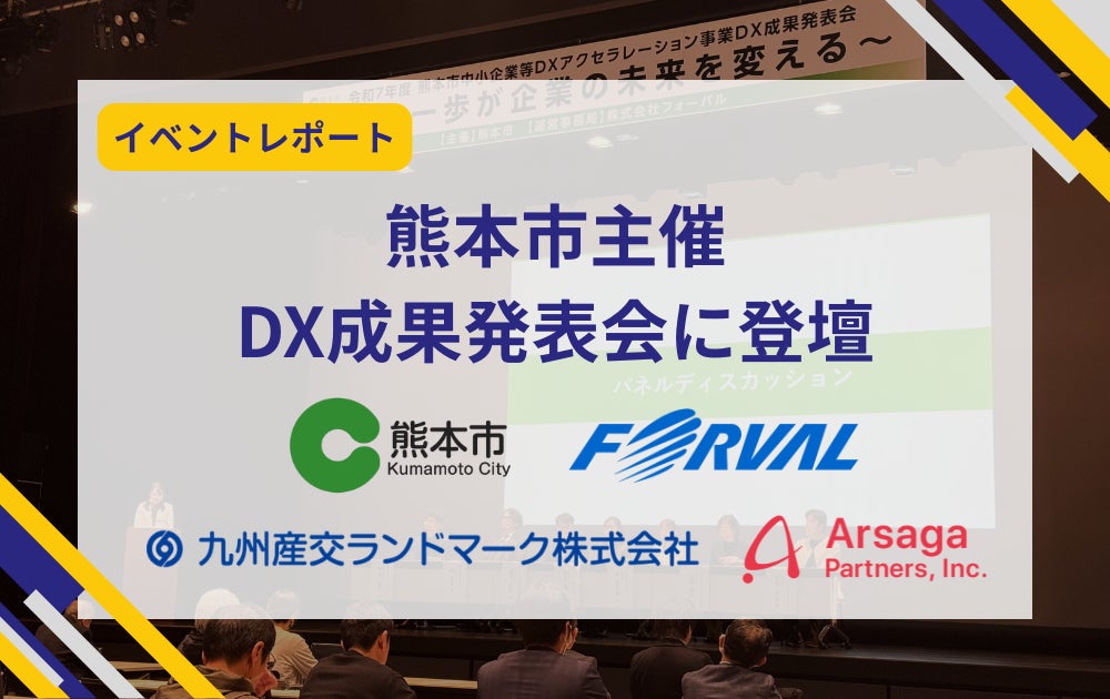 企業のDXを促進するアルサーガパートナーズ株式会社(本社:東京都渋谷区、代表取締役会長兼CTO:小俣泰明、代表取締役CEO:渡邉純平、以下「アルサーガパートナーズ」)は、熊本市が主催し、株式会社フォーバル(本社:東京都渋谷区、代表取締役社長:中島將典、以下「フォーバル」)が運営事務局を務める「熊本市中小企業等DXアクセラレーション事業」において、伴走支援を実施いたしました。