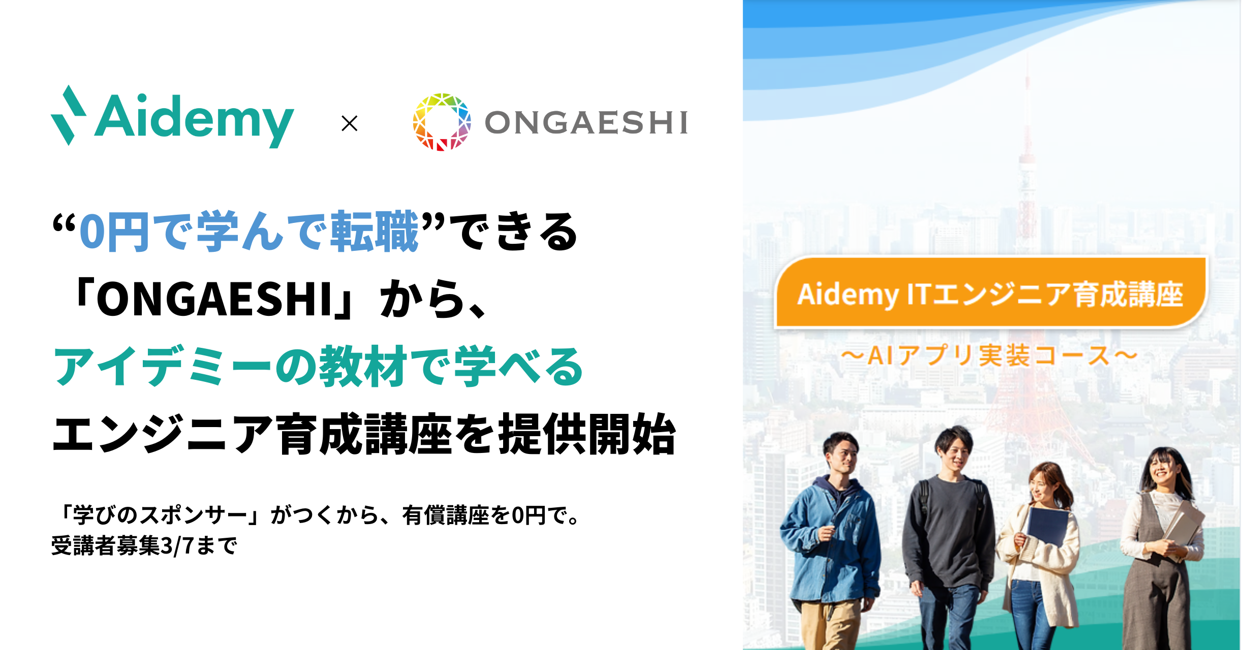 “0円で学んで転職”できる「ONGAESHI」から、アイデミーの教材で学べるエンジニア育成講座を提供開始