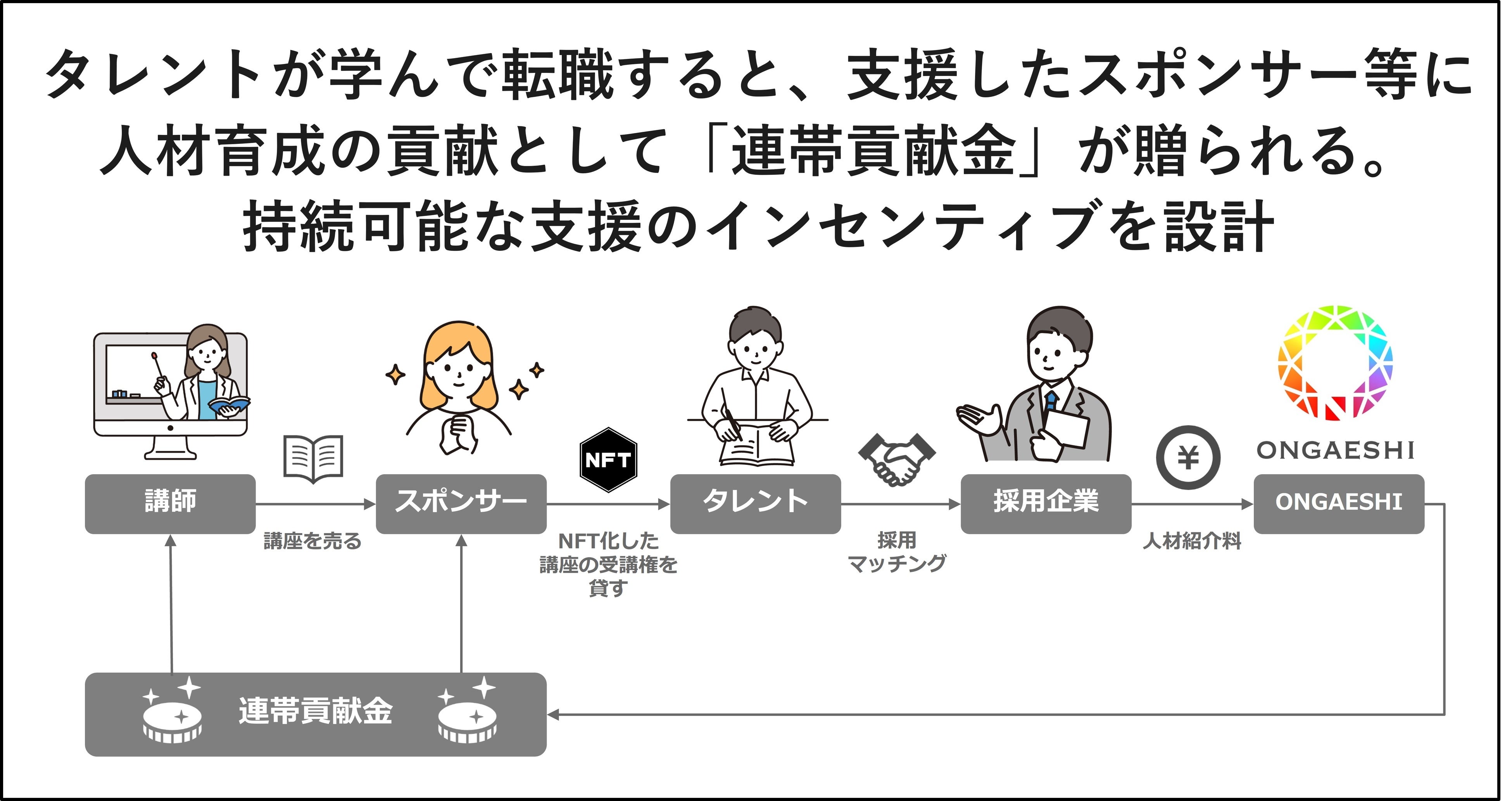 ONGAESHIは、「学びのスポンサー」が購入した「学ぶ権利(受講権)」をタレントに貸すことで、無償の学びと転職を支援する仕組みです。タレントが学んで転職すると、学びのスポンサーや講座提供者などに、人材育成の貢献の返礼として連帯貢献金(※2)が贈られます。さらに、タレントの学習進捗に応じて、最大500 ONGAESHIコイン(※3)がタレントとスポンサーそれぞれに付与されます。(Learn to earn機能)