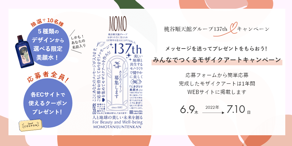 当社は、創業者 桃谷政次郎がにきびに悩む妻を笑顔にしたいという想いから生まれたにきびとり美顔水をきっかけに創業しました。悩みを解決してあげたい、人々のお役に立ちたいという創業者の想いは変わることなく受け継がれ、時流に合った商品・サービスをお届けしてまいりました。137年もの間、当社商品を選んでいただき、生活の一部として過ごすことが出来た喜びをお客さまと共に形にしたいと考え、創業の原点である「美顔水」をアートのモチーフに採用しました。皆さまの想いが詰まったモザイクアートは137周年の1年間当社ホームページに掲載し、皆さまの想いと一緒に周年を祝います。