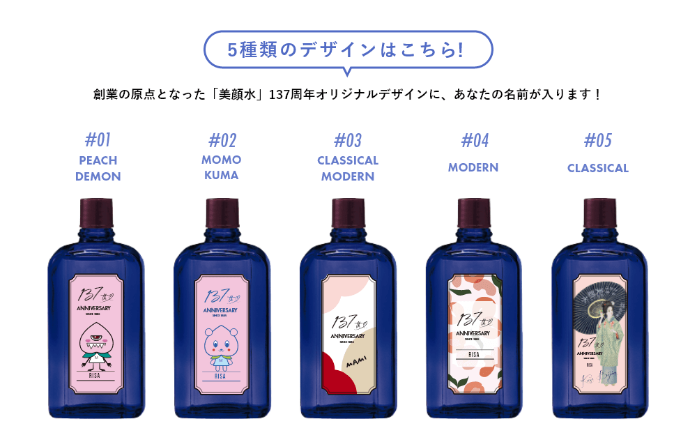プレゼント: ①<抽選で10名様>選べる137周年限定オリジナルデザイン美顔水