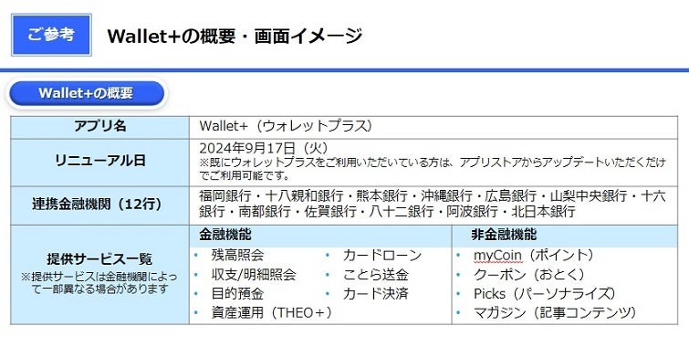 株式会社ふくおかフィナンシャルグループ(取締役社長 五島 久)傘下のiBankマーケティング株式会社(代表取締役社長 明石 俊彦)は、本日、銀行公式無料アプリ「Wallet+(以下、ウォレットプラス)」のリニューアルを実施いたしましたのでお知らせいたします。
