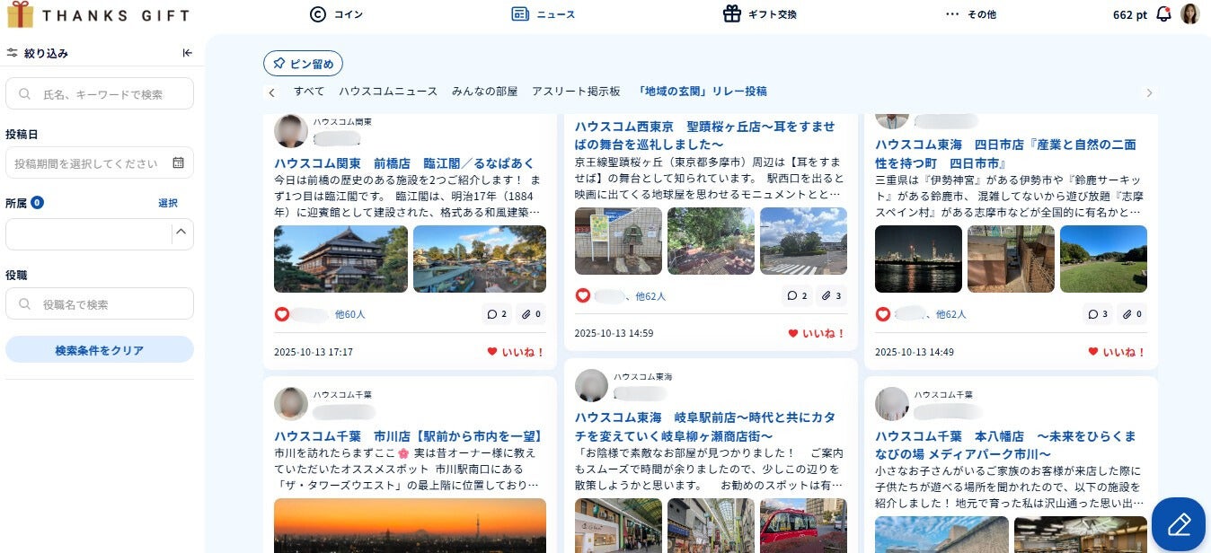 また、導入時から現在までに従業員同士で贈り合ったコインの総流通量は約5.6万件にのぼり、従業員数から試算すると1人あたり平均約50回の感謝が社内でやり取りされています。さらに、掲示板の投稿数は累計618件(2026年3月12日現在)となり、1年前と比べて約5倍に増加しています。