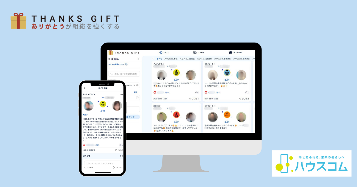ハウスコムは2024年9月より、従業員同士が日々の感謝や応援の気持ちをコインとして贈り合う社内コミュニケーションプラットフォーム「THANKS GIFT」を導入しています。現在、全国240店舗以上、約1,200名の従業員が利用しており、利用率はほぼ100%、稼働率は直近の2月時点で74%と、多くの従業員に日常的に活用されています。