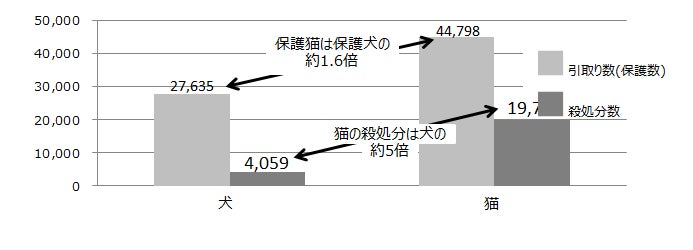 環境省の統計によると、昭和49年の統計開始時保健所による犬、猫の引き取り件数は1,250千件、殺処分率は97.7%でした。しかしその後、2013年より殺処分ゼロに向けた取り組みが広く行われ、令和2年の統計では引き取り件数72千件、殺処分率32.8%と、大幅に減少しました。しかし、犬と比べ猫は繁殖能力が高く、飼養者の管理不足による多頭飼育の崩壊に陥るケースや、野外繁殖の問題などにより、猫の引き取り件数は犬の約1.6倍、殺処分数は犬の約5倍という現状があります。