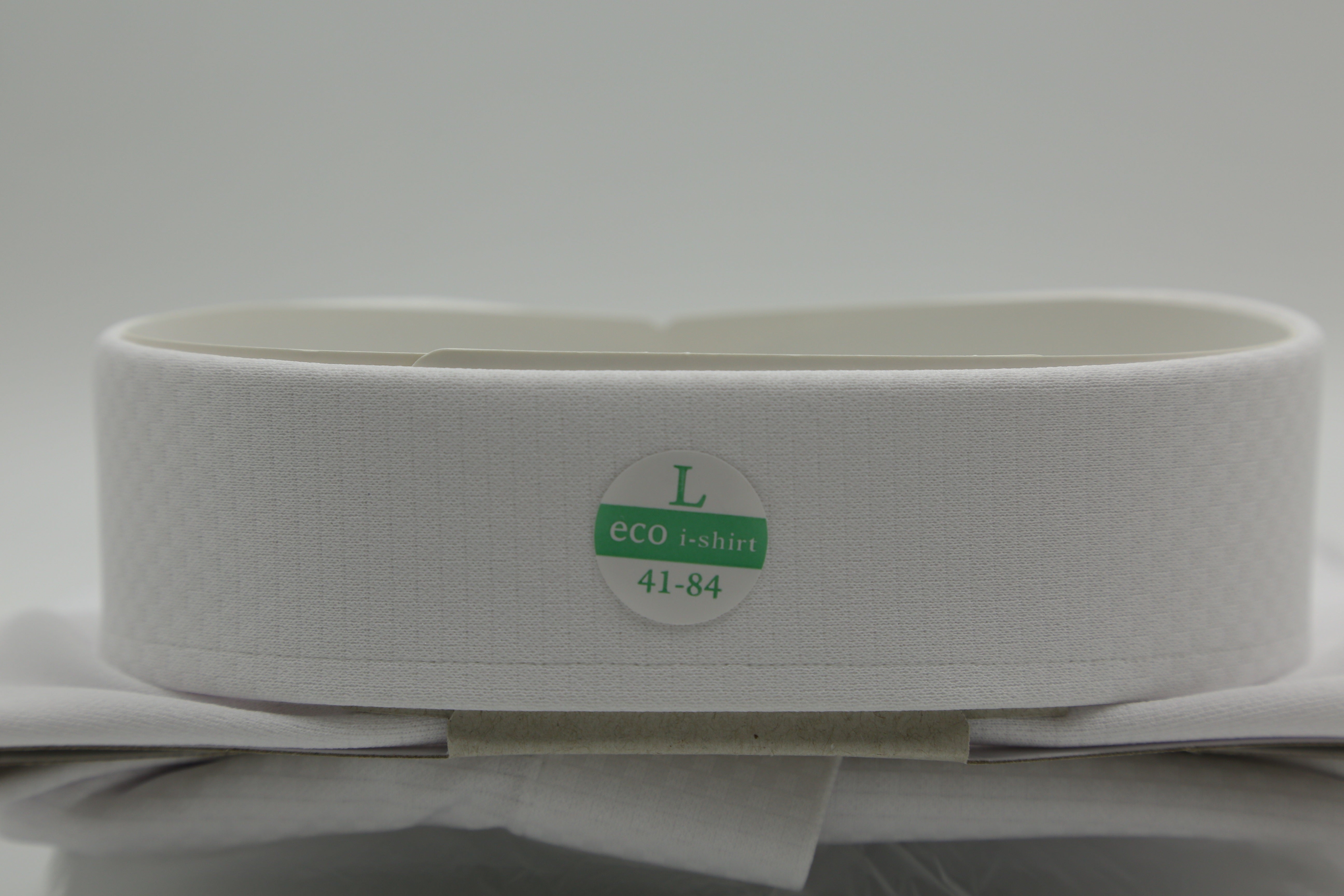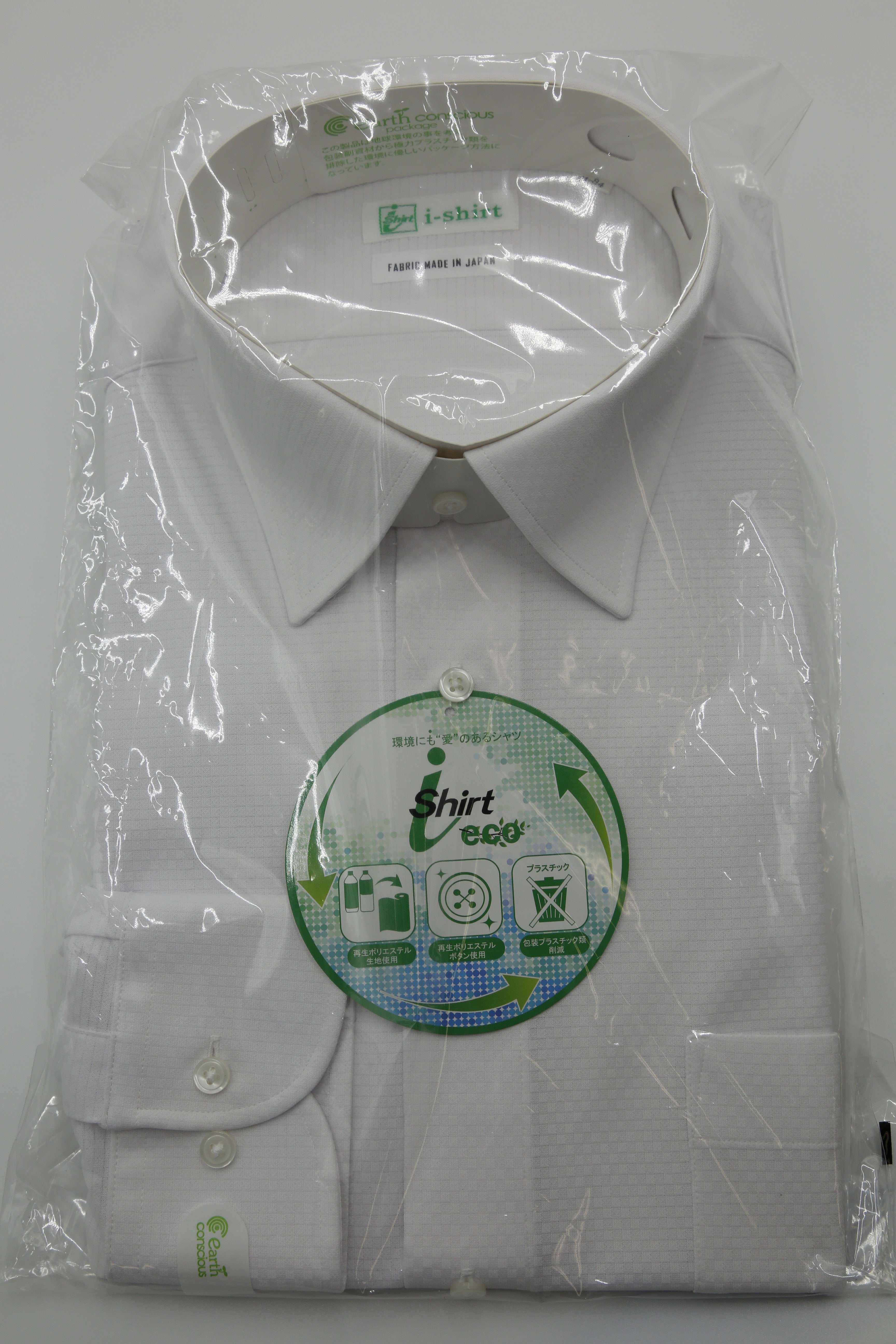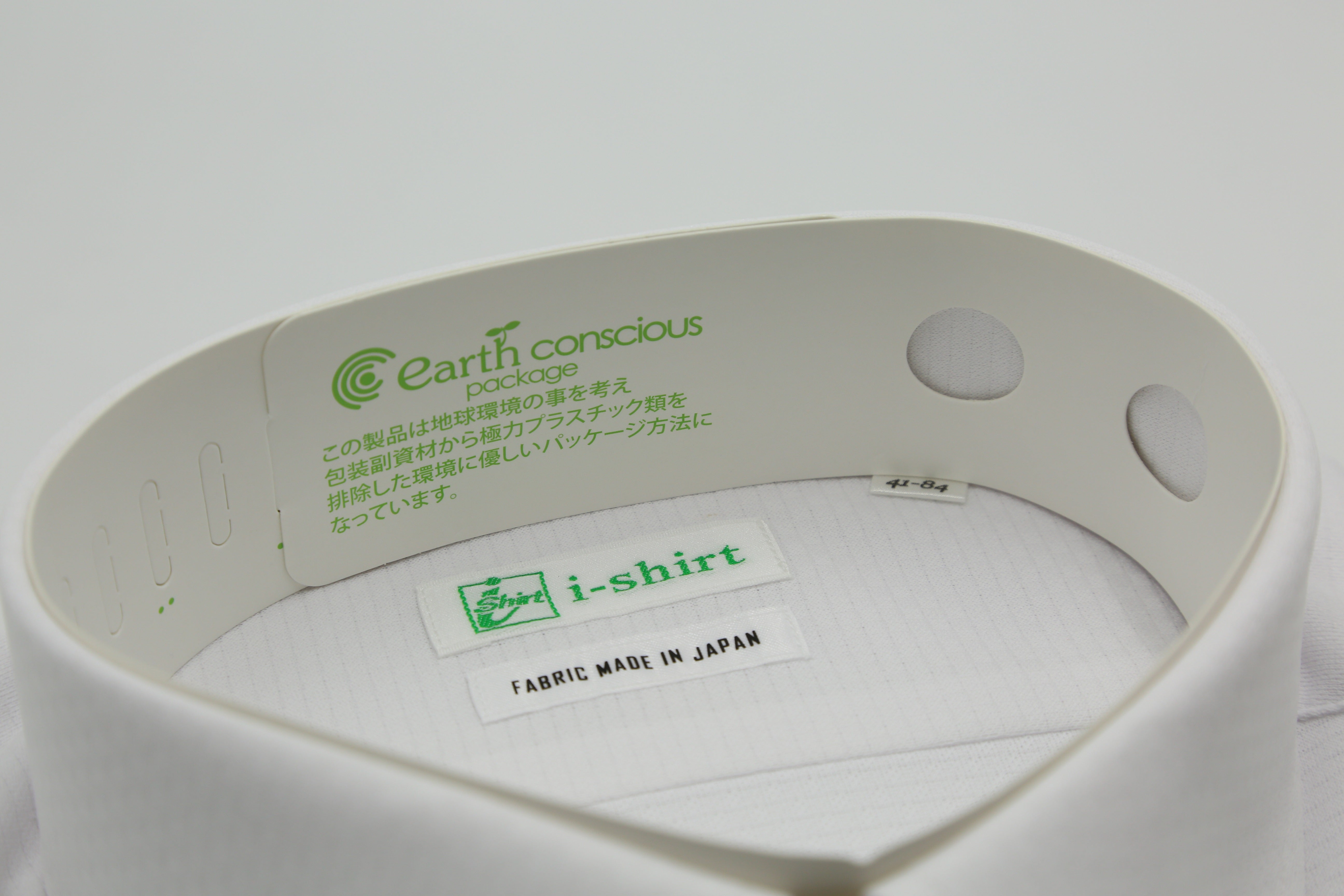 今回の「ECO i-Shirt」には、店頭陳列時に衿の型崩れを防止する衿キーパー、クリップを紙製に変更、包装袋の素材をバイオマス素材とし、プラスチック製キーパーは使用しておりません。