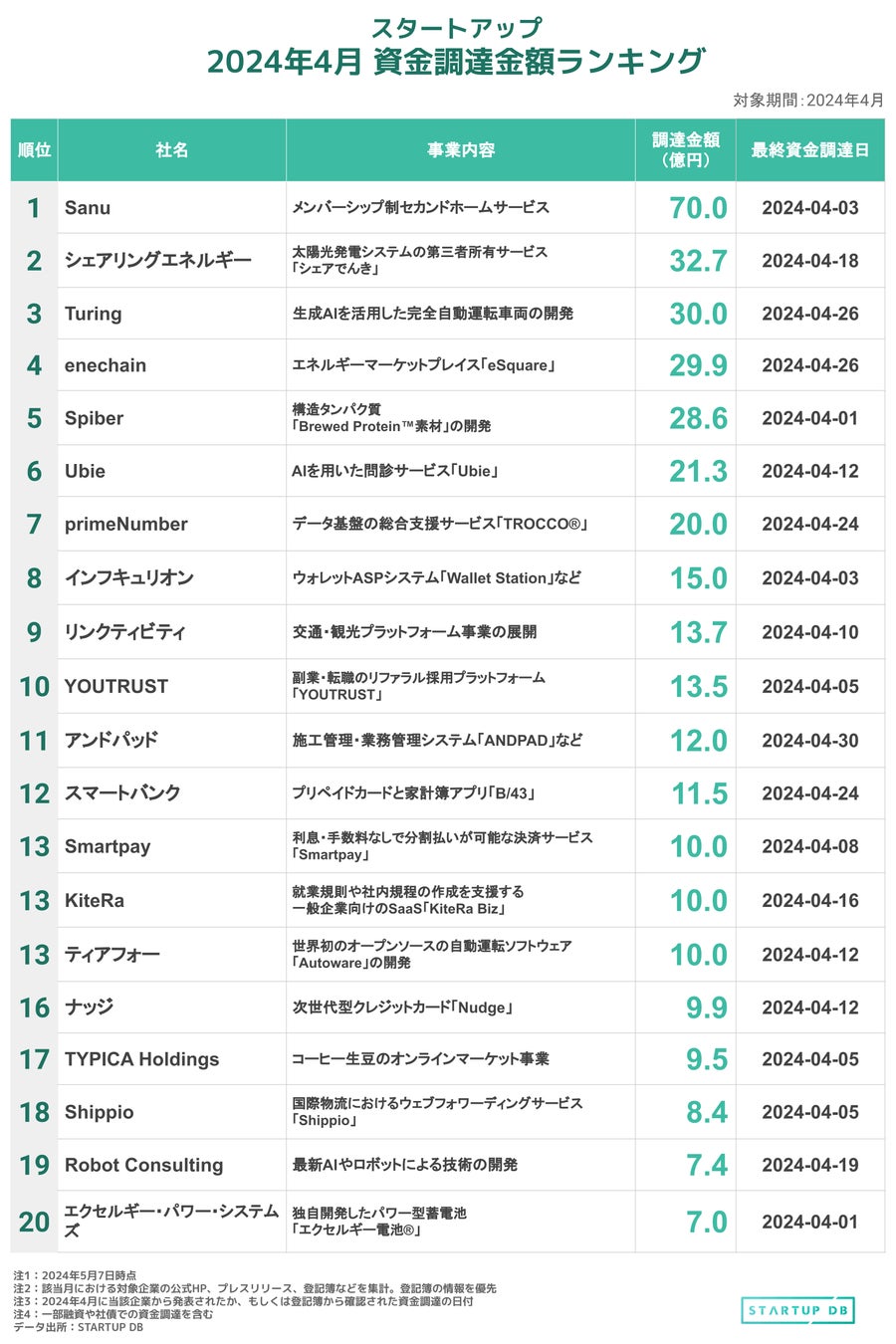 ・レポート記事:STARTUP DB (https://journal.startup-db.com/articles/funding-ranking-202404)