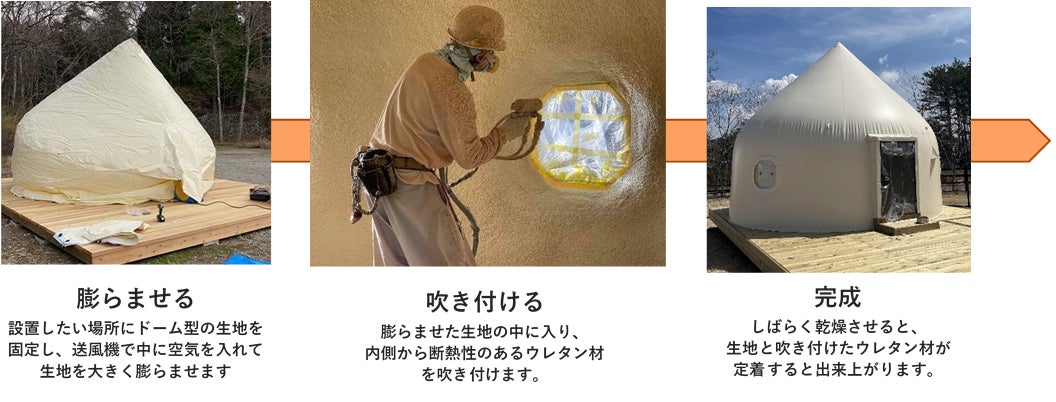 「インスタントハウス」はテントシートを空気で膨らませ、内側から断熱材に使用されている硬質発砲ウレタンを吹き付け施工します。インスタントハウスが災害用仮設住宅にマッチするポイントは、シンプルな工法で1棟あたり3~4時間の短時間に建設可能なだけでなく、断熱性や耐久性に優れ、さらに耐震性(※1)、耐風性(※2)をあわせ持つことから、ワークスペースや宿泊スペースだけでなく、避難所の医療救護室や子どもやコミュニティの休憩所、断熱を要する備蓄倉庫などにも活用できます。