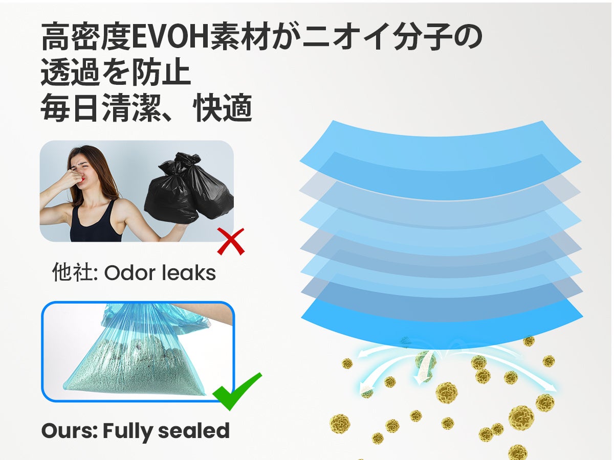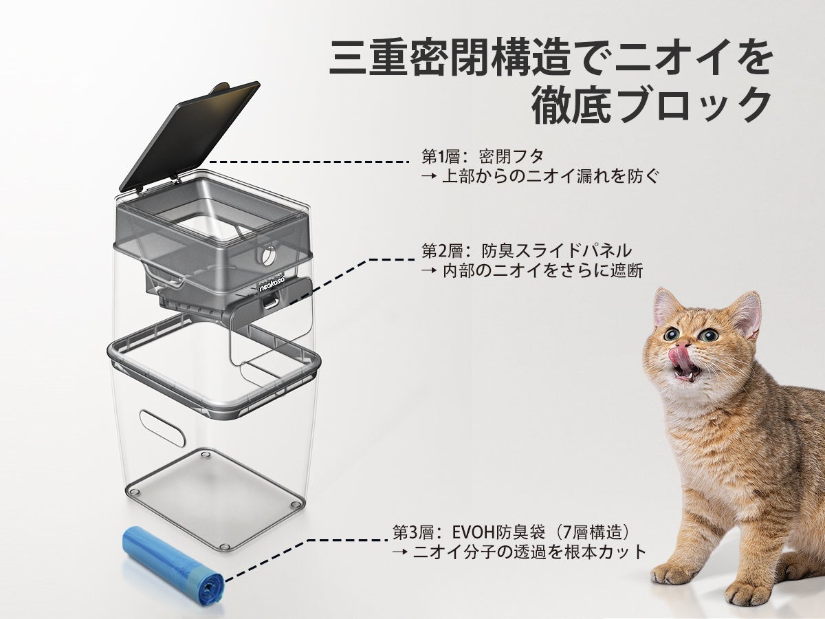 専用の7層EVOH構造防臭袋を採用し、猫砂やうんち袋などのニオイをしっかり閉じ込めます。キッチンやリビングに置いても気にならない清潔感をキープ。