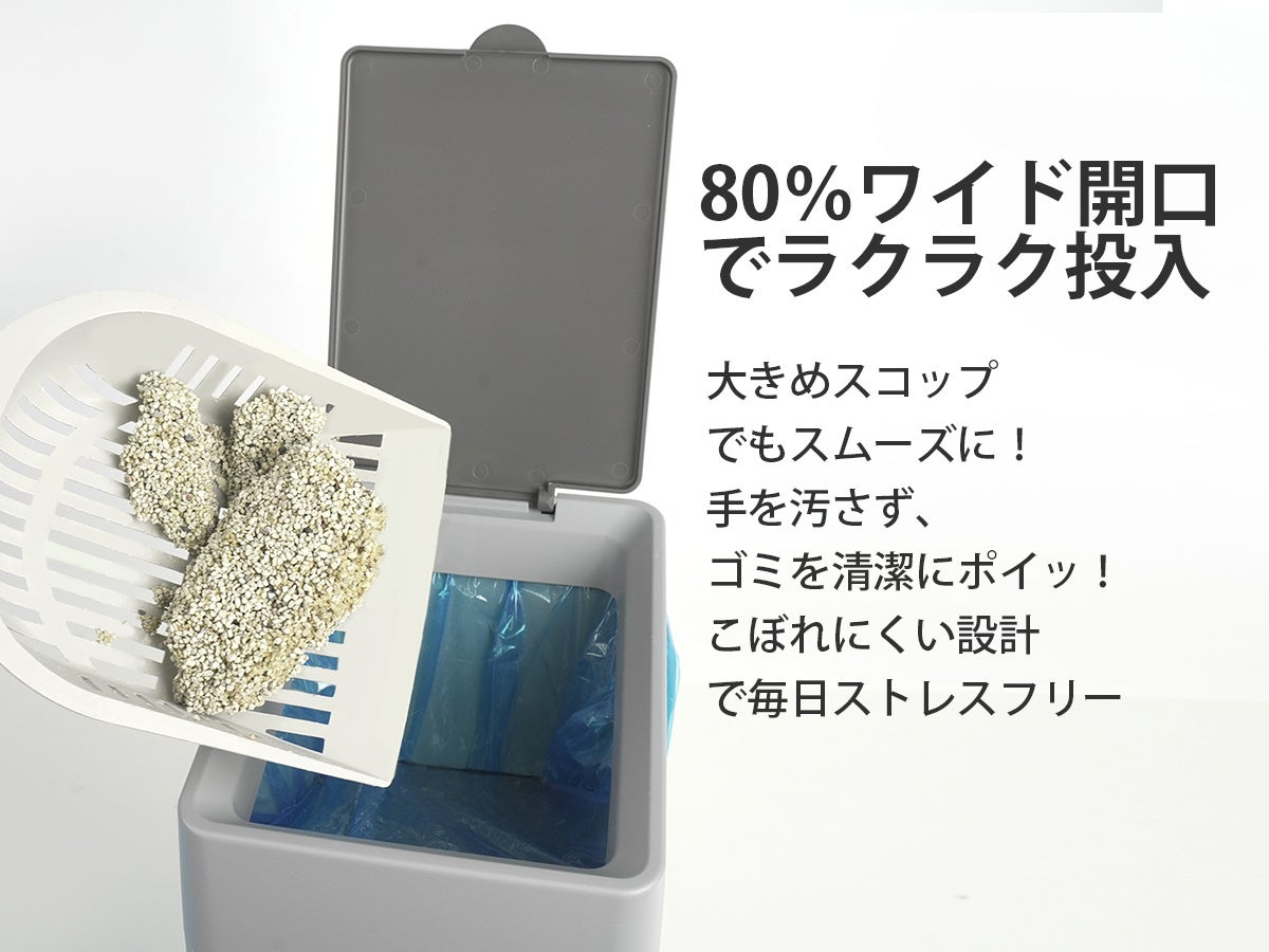 一般的なペット用ゴミ箱に比べて大きめの容量設計。忙しい日々の中でも、毎日ゴミを捨てる手間から解放されます。