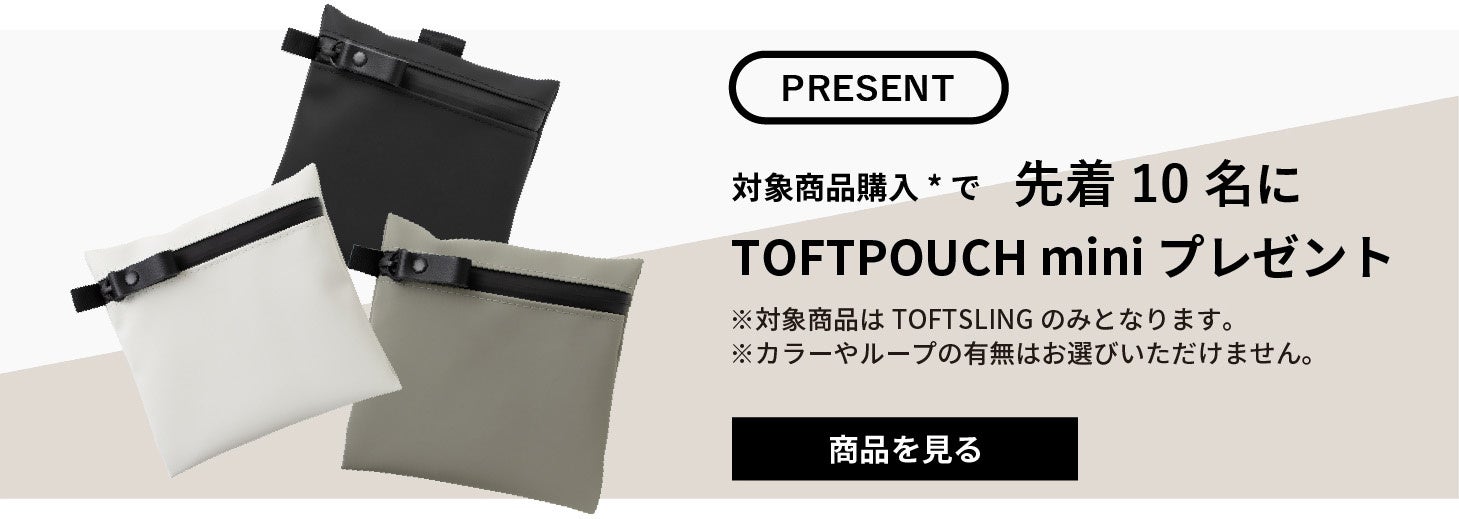 さらに、TOFTSLINGをご購入いただいた方先着10名にTOFTPOUCH miniがついてくるプレゼントキャンペーンも開催。