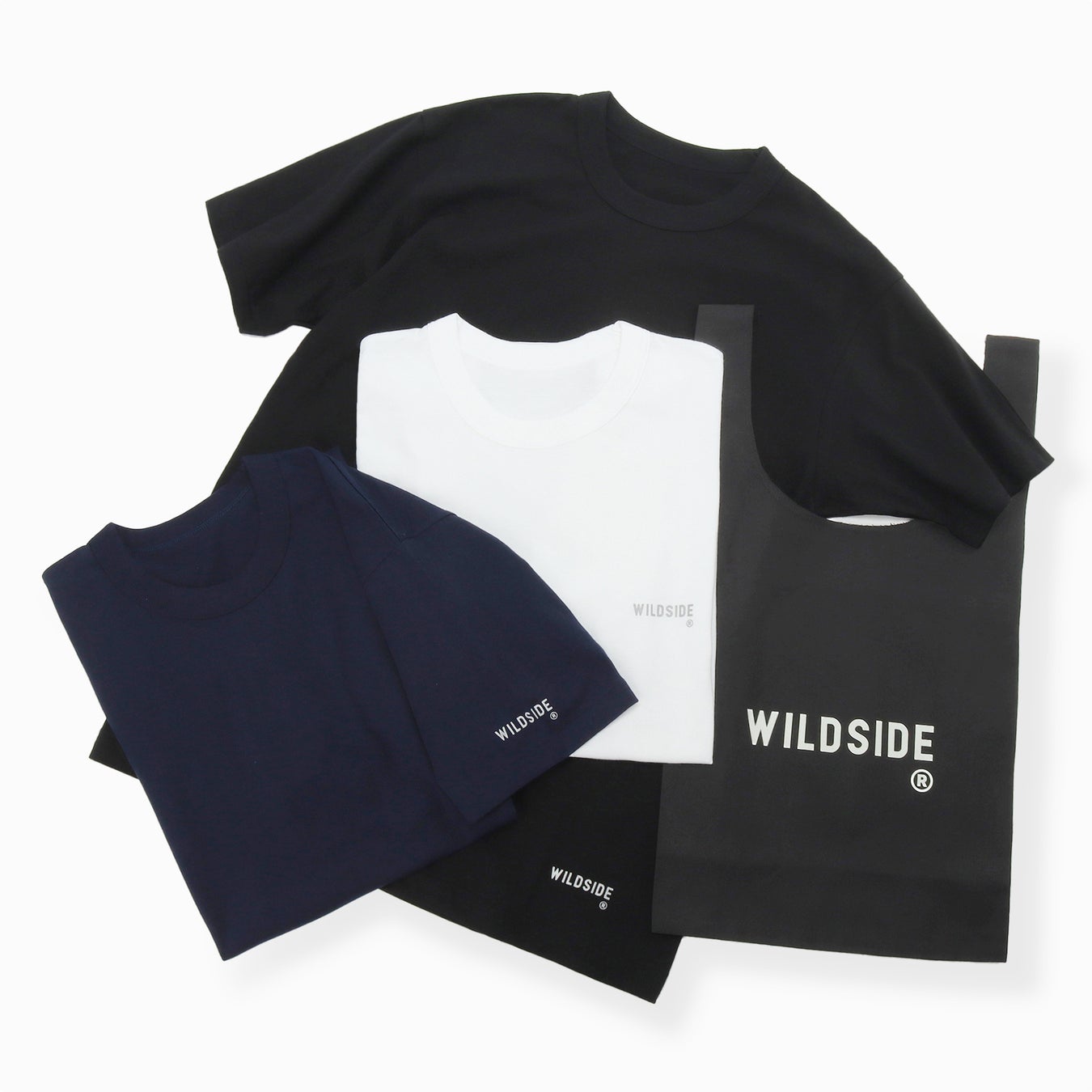<WILDSIDE YOHJI YAMAMOTO>オリジナル初のTシャツ3枚セットが登場いたします。ホワイト、ネイビー、ブラックが各1枚ずつ、3枚セットになったWILDIDEロゴ入り半袖Tシャツ。ホワイトは胸元、ネイビーは左袖、ブラックは裾と、色によってロゴの入っている位置が異なるユニークな組み合わせです。付属としてロゴ入りバックも付いています。