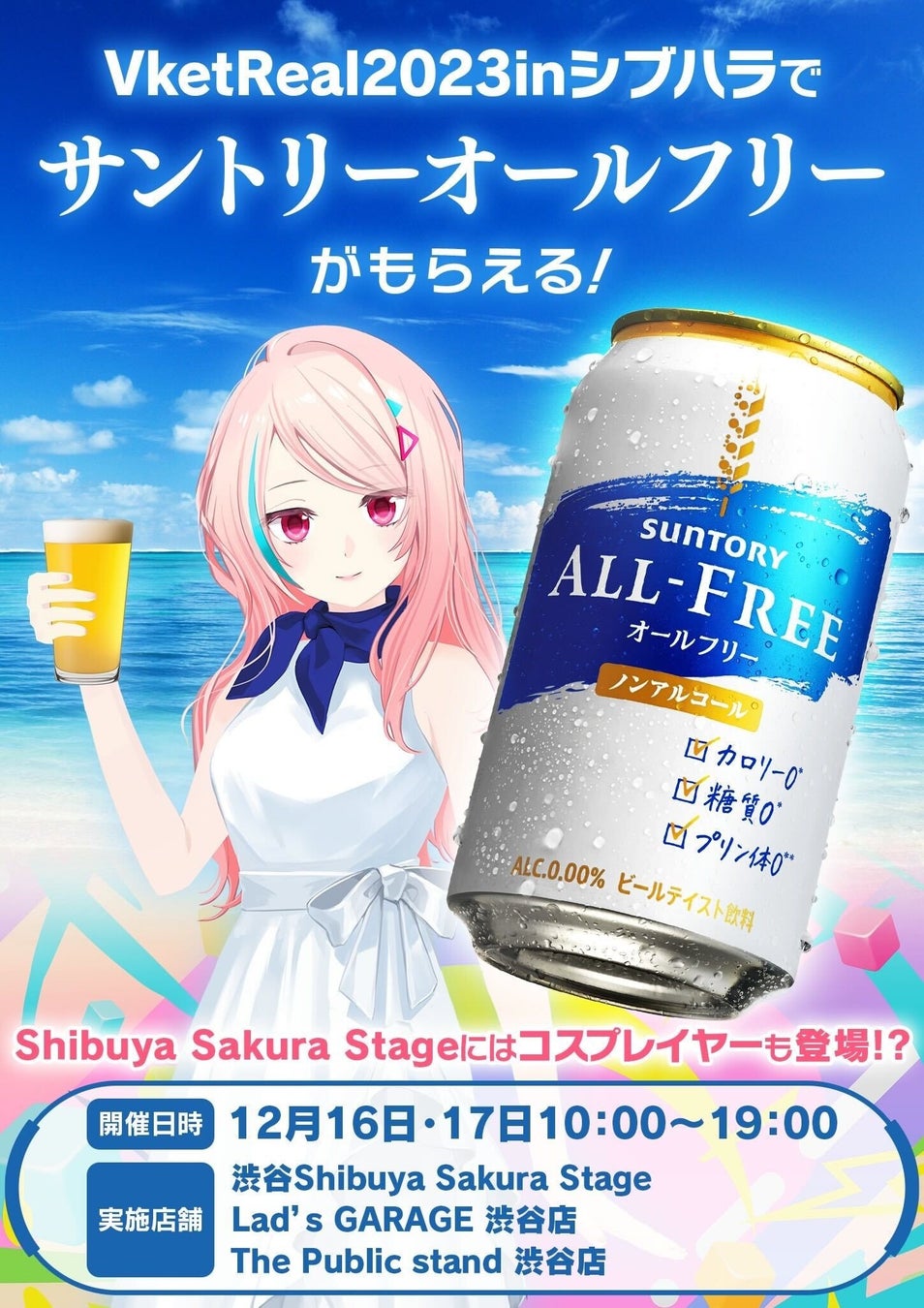 サントリー株式会社がVketRealに初出展!ノンアルコールビールテイスト飲料「オールフリー」を紹介するブースを展開します。Shibuya Sakura Stageのブースでは、大人になった“Vketさん”のコスプレをしたコスプレイヤーが登場し、オールフリーの無料配布を実施!その他、公式オフ会会場のLad’s GARAGE 渋谷店、The Public stand 渋谷店でも無料配布を実施します。