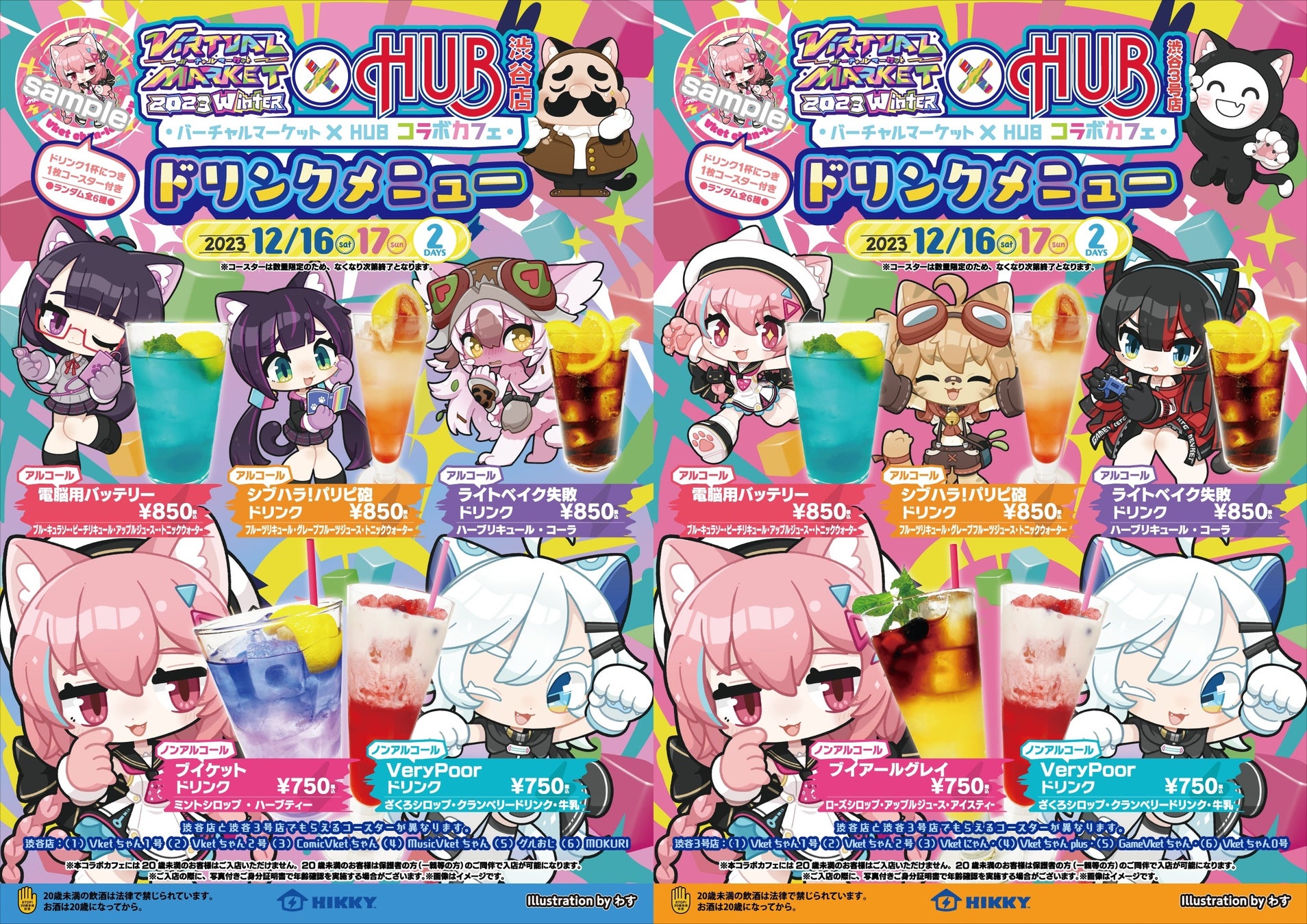 HUB渋谷店(https://www.pub-hub.com/index.php/shop/detail/2 )と、HUB渋谷3号店(https://www.pub-hub.com/index.php/shop/detail/123 )の渋谷のHUB2店舗とコラボし、今回もバーチャルマーケットオリジナルドリンクの販売を実施いたします。コラボドリンク1杯のご注文につき、バーチャルマーケットオリジナルコースターが1枚ランダムで付いてきます。店舗限定のドリンクもございますので、ぜひ2店舗ともご来場いただきコンプリートを目指してください!