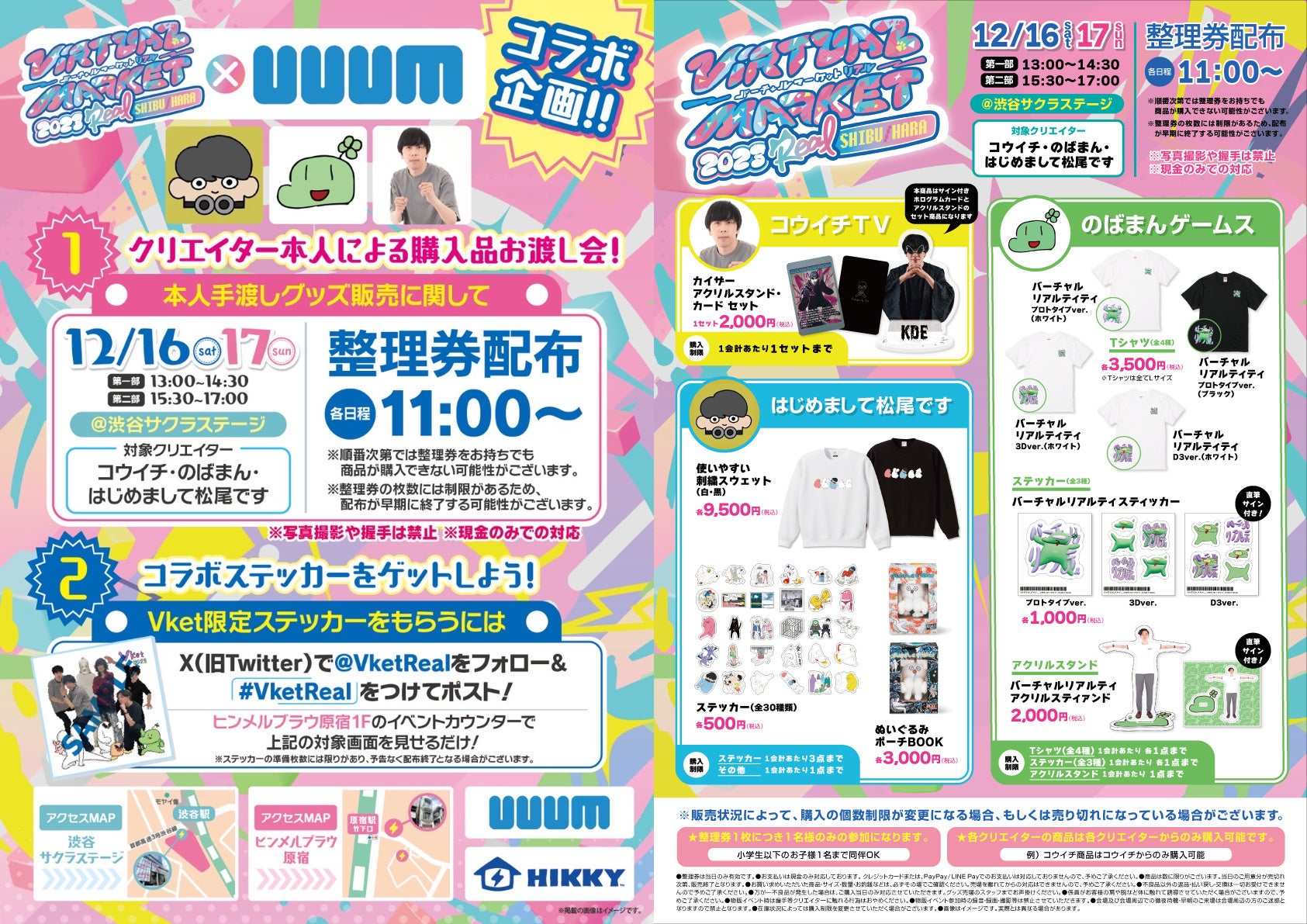 UUUM株式会社がVketRealにもブースを出展!UUUM所属クリエイターのコウイチ(https://www.youtube.com/user/kouichitv )、のばまん(https://www.youtube.com/nobamangames )、はじめまして松尾です(https://www.youtube.com/@hajimemashite )のリアルグッズを、なんとクリエイター本人が手渡しで販売します!