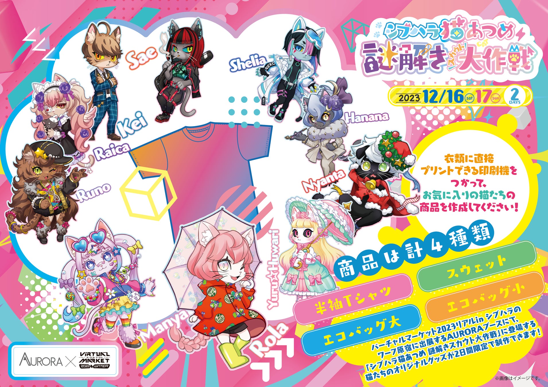 VketRealへは初出展となるオーロラ株式会社のブースでは、謎解きゲーム『シブハラ猫あつめ 謎解きスカウト大作戦』(https://event.vket.com/2023Winter/real/riddle )に登場する猫たちのオリジナルグッズやロゴなどを2日間限定で制作することが可能です。商品は、半袖Tシャツ、キッズ半袖Tシャツ、スウェット、エコバッグ(大と小)の全5種類!圧着機を使ってお気に入りの猫たちの商品をその場で制作してください!