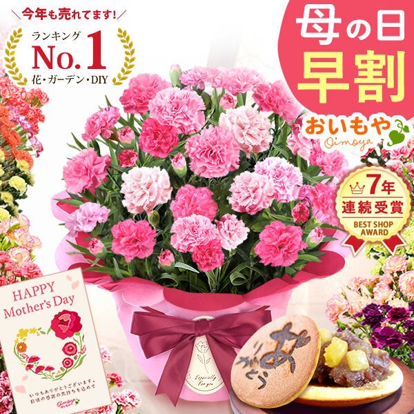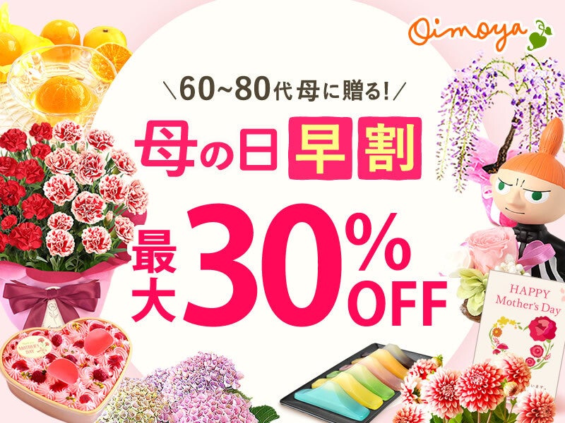 花やスイーツなどを取り扱う「おいもや」において、対象商品のご購入で最大30%割引のタイムセールのほか、最大10%のポイント還元を実施します。さらに、花やスイーツなど母の日に向けた目玉商品が全商品早割価格でおトクにご購入いただけます。