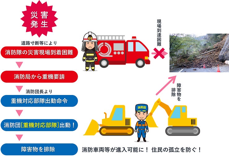 この重機対応部隊は、消防団員や消防団員が勤務する事業所等が所有または管理している重機を使用して、緊急車両などが土砂災害等により道路が寸断された際に通行できるよう障害物を排除し、初動活動を早期に確立させ、消防活動が円滑に行えるようにすることを目的に組織されます。