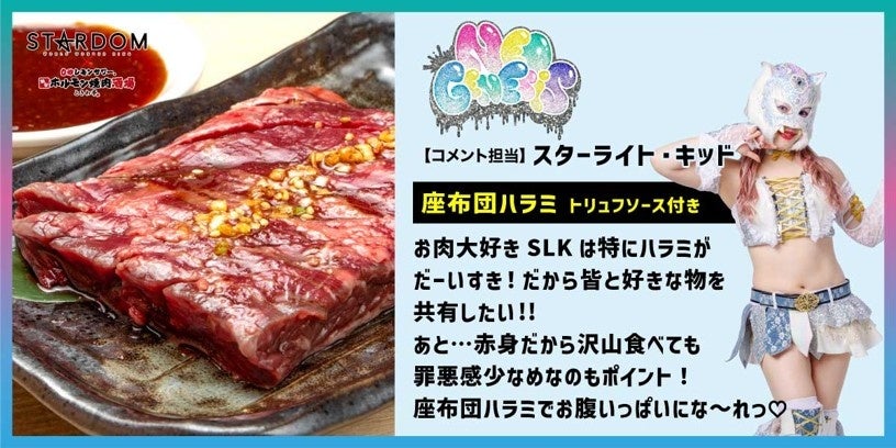 期間中、対象店舗にてオリジナルノベルティグッズ付きのコラボメニュー7品をおすすめ販売します。選手が選んだおすすめお肉メニューをご注文の方には、スターダムコースター(6種ランダム)をプレゼント。また、「0秒レモンサワー®」の「スターダムシロップ」をご注文の方に、限定スターダムステッカーをプレゼントします。