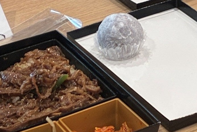 集合時にはやや緊張した様子も見られた学生の皆さんにリラックスしていただくため、軽食として、受賞チーム名にちなんだ焼肉弁当といちご大福をサプライズで用意いたしました。