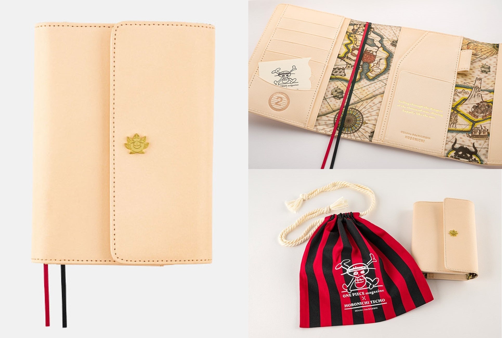 サウザンド・サニー号をモチーフにした革の手帳カバーです(オリジナルとカズンの2サイズ)。素材には、時間とともに色が濃く変化し、味わいを増すヌメ革を使用。大切に使いながら、自分だけのカバーとして育てていく楽しみも味わえます。3つ折りタイプのカバーで、カバーの開閉部分にサニー号の顔をかたどった金色のボタンをつけました。内側の布部分には海図をプリント。ペンフックやしおりも付いています。購入時には、サニー号の帆をイメージした巾着に入れてお届けします。