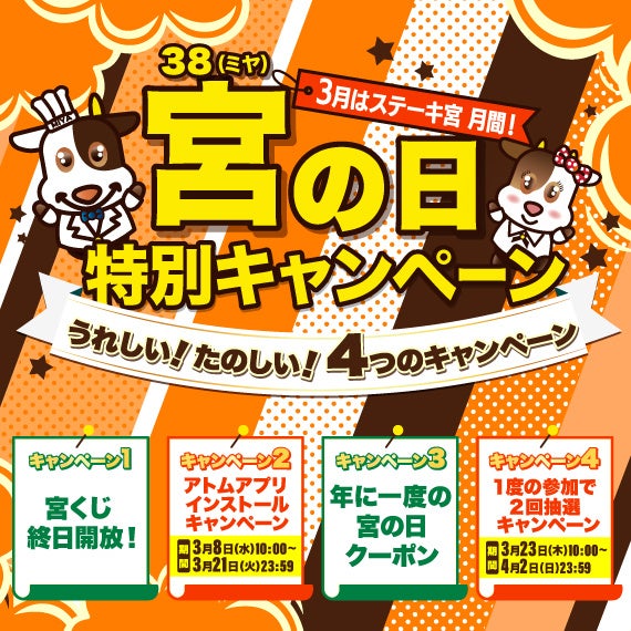 コロワイドグループの株式会社アトム(本社:神奈川県横浜市、代表取締役社長:山角豪)は、「ステーキ宮」各店で、2023年3月8日(水)より2023年4月2日(日)までの2週間、オトクがいっぱい!4つの「宮の日」特別キャンペーンを実施いたします。