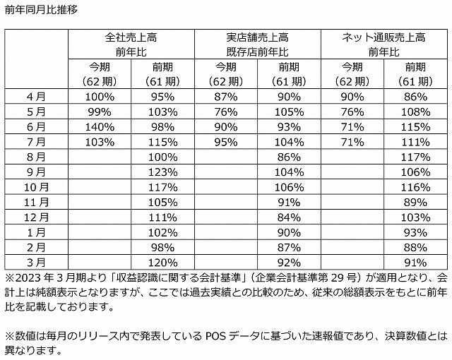 株式会社セキド(本社・東京都新宿区、社長・関戸正実、証券コード:9878)は、2023年7月度(6月21日~7月20日)の売上高が、全社の前年比103%、GINZALoveLove実店舗の既存店前年比95%、ネット通販の前年比71%となりました。なお、数値はPOSデータに基づいた速報値であり、決算数値とは異なります。