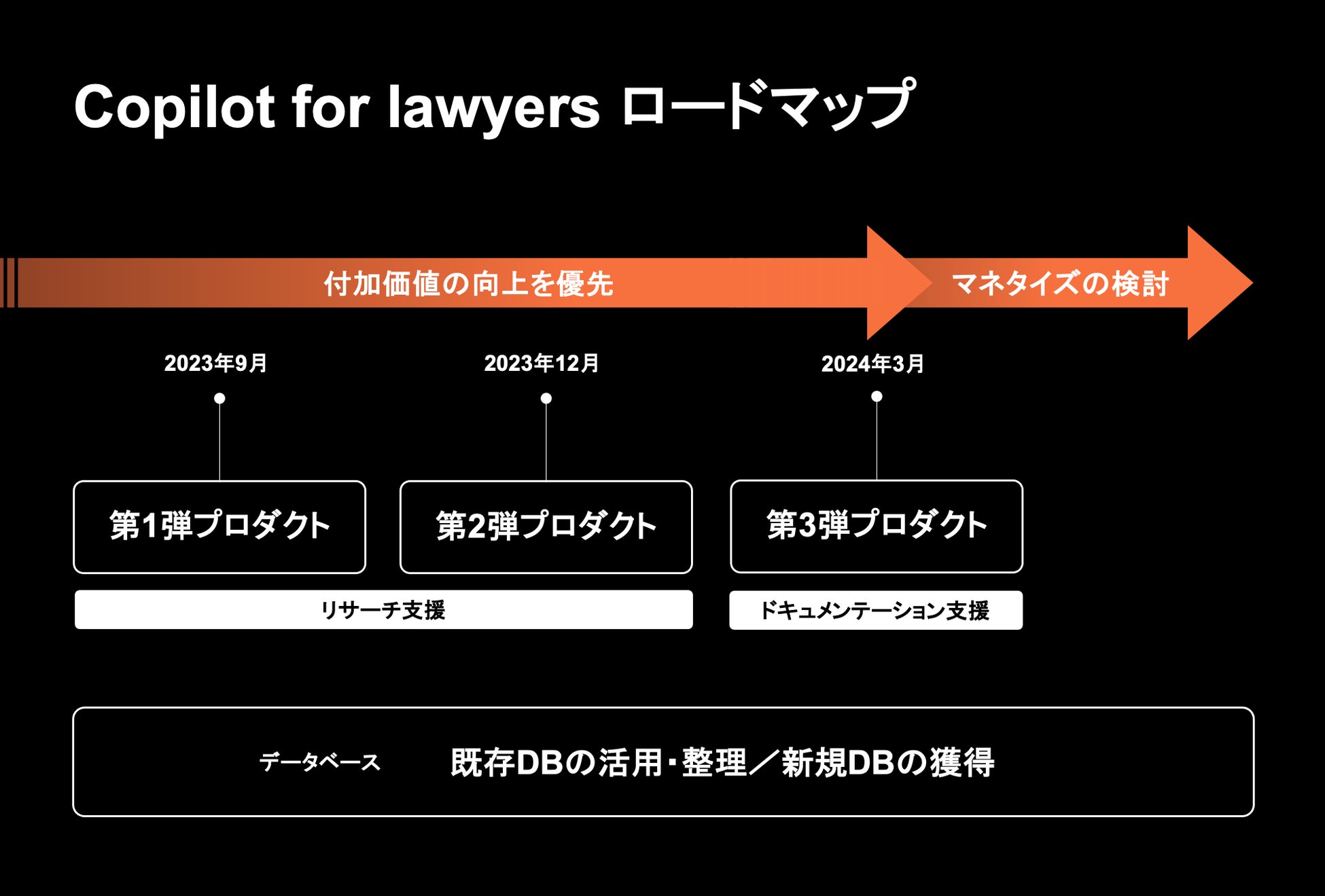 今後の「Copilot for lawyers」のロードマップとしては、既存データベースの活用・整理と、新規データベースの獲得を推進しながら、2023年12月には第2弾となるプロダクトを公開し、実務に役立ていただける付加価値の向上を目指します。2024年3月には、第3弾となるドキュメンテーション支援のプロダクトを公開し、これまでの実務にかかる工数を大幅に削減するサービスの提供を開始いたします。これらの開発・運営と同時に、企業法務の実務における検証も行い、さらなる事業拡大に向けた検討も行ってまいります。