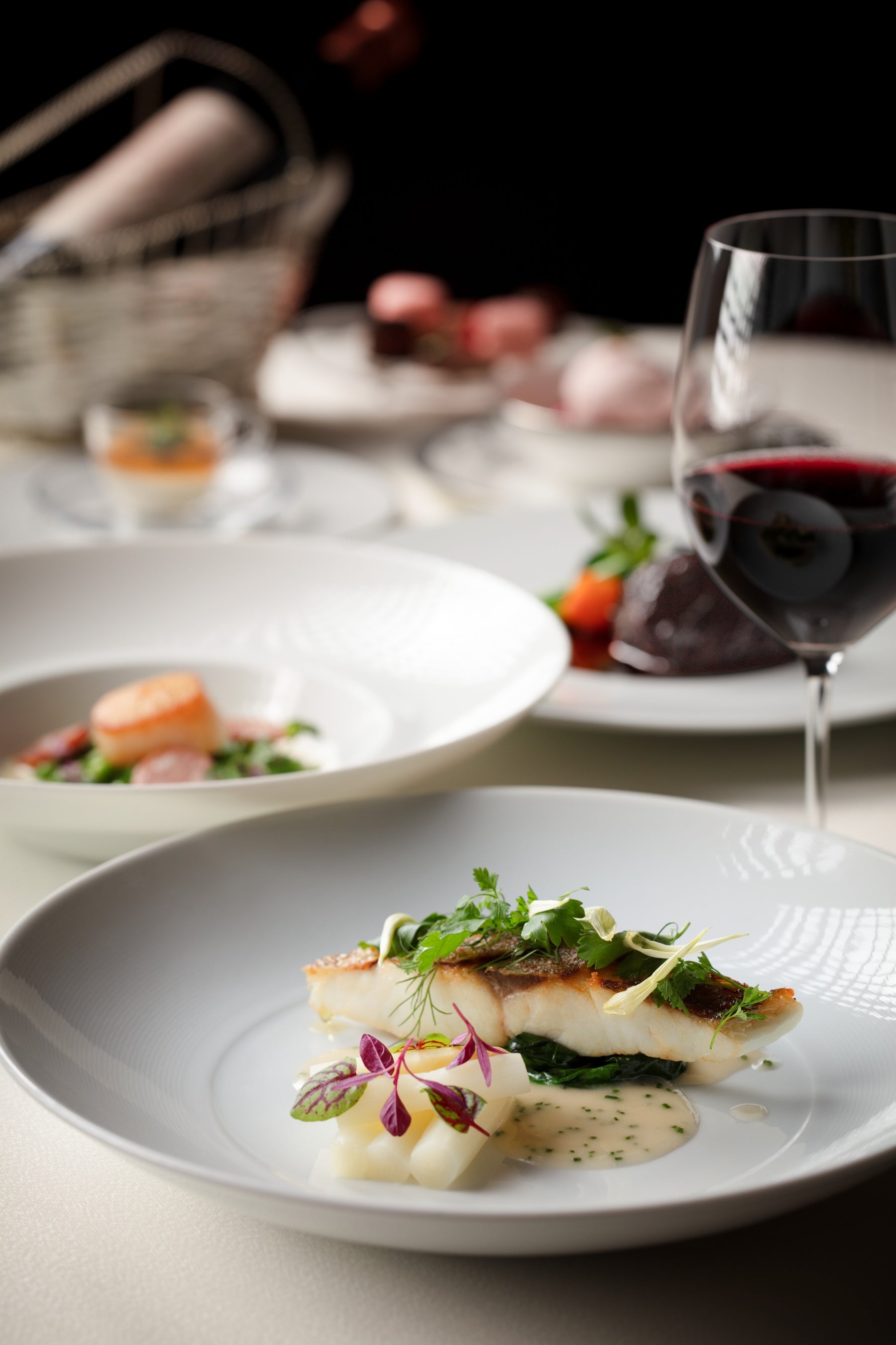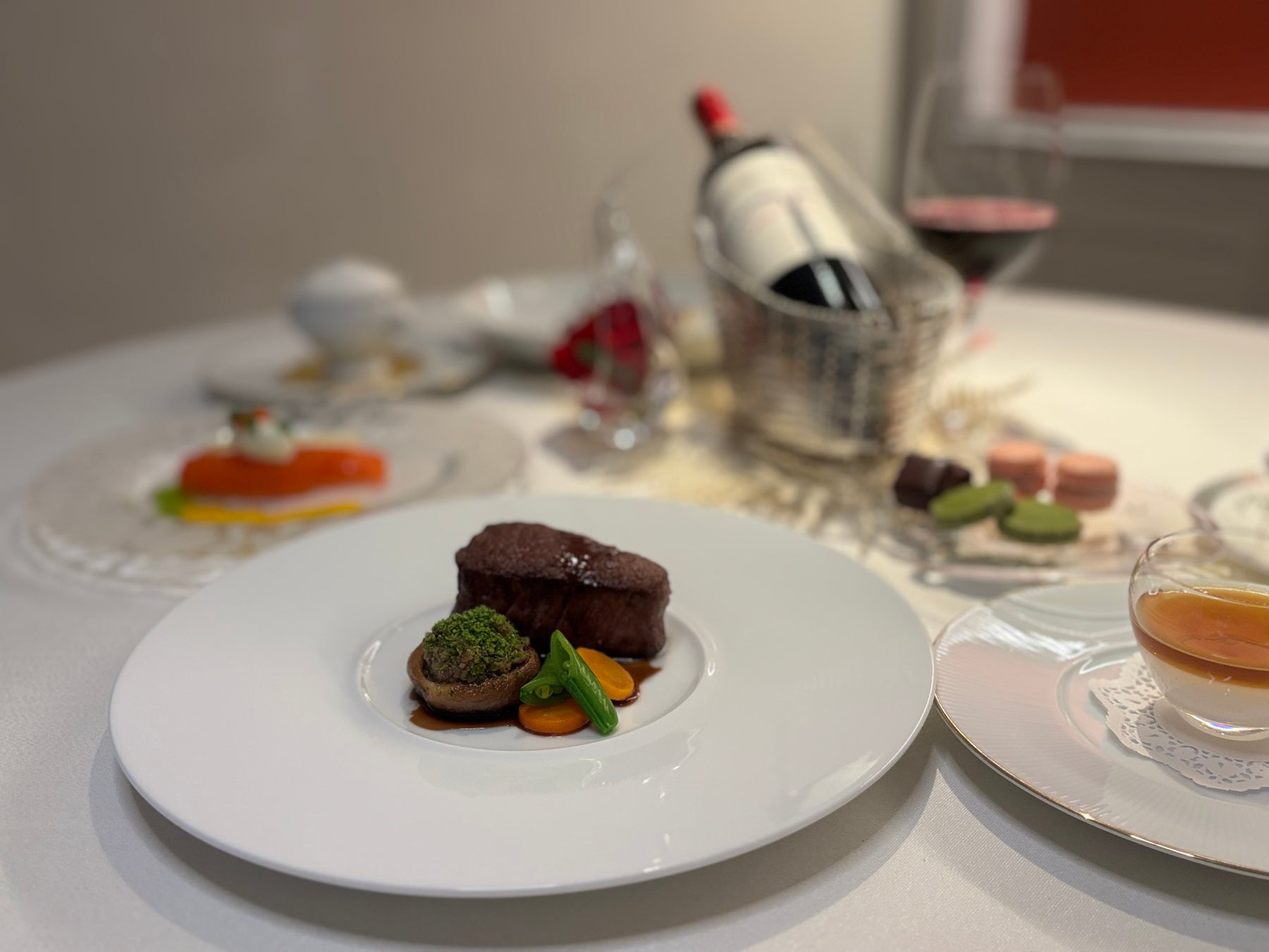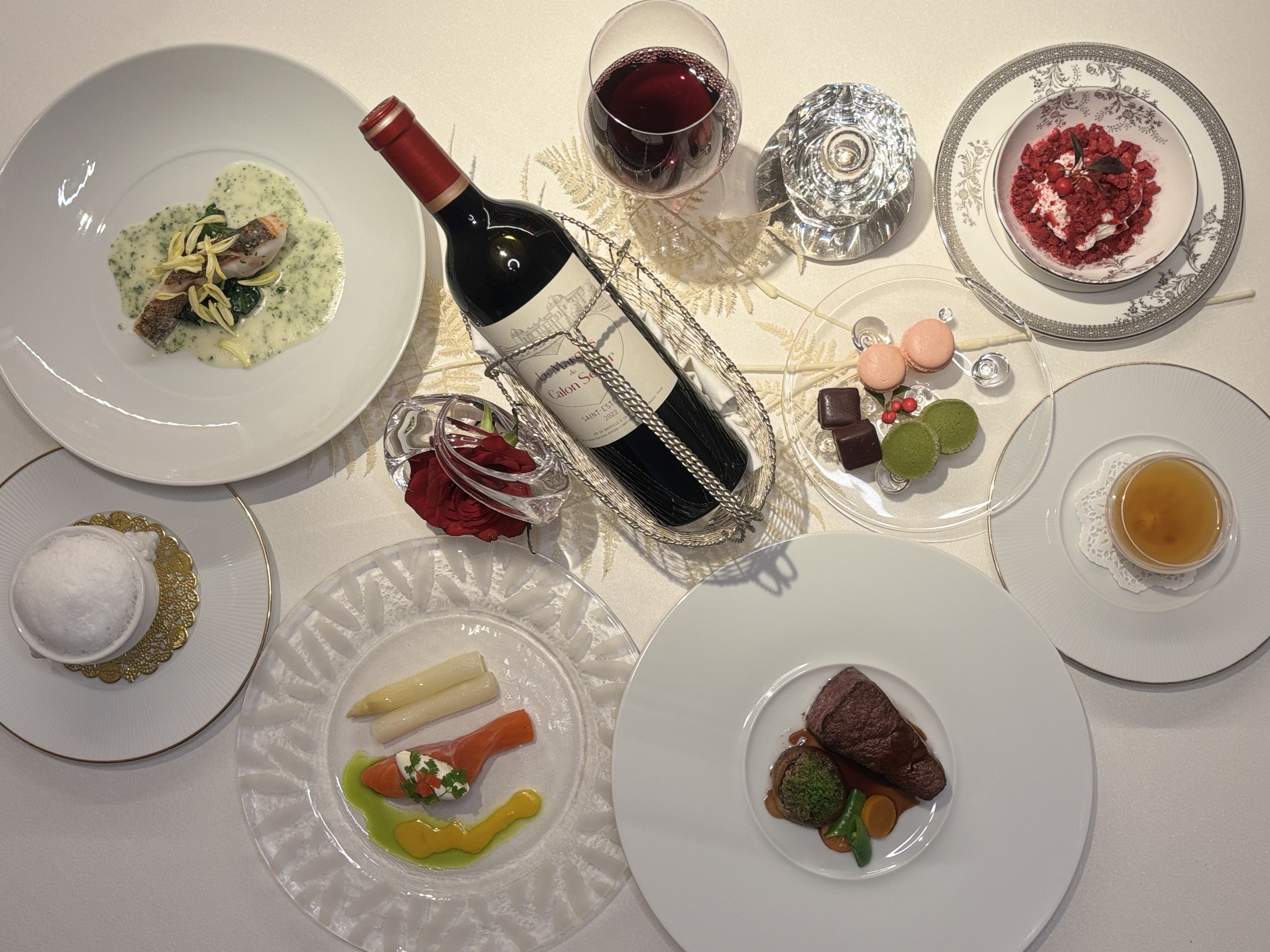 前菜に続き、ハタのポワレ、そして香ばしく焼き上げた牛フィレ肉をご提供。コースの締めくくりには、“白”を象徴するホワイトチョコレートのデザートをご用意しました。甘さを控えた軽やかな仕立てで、最後まで心地よい余韻を残しながらコース全体をやさしくまとめます。