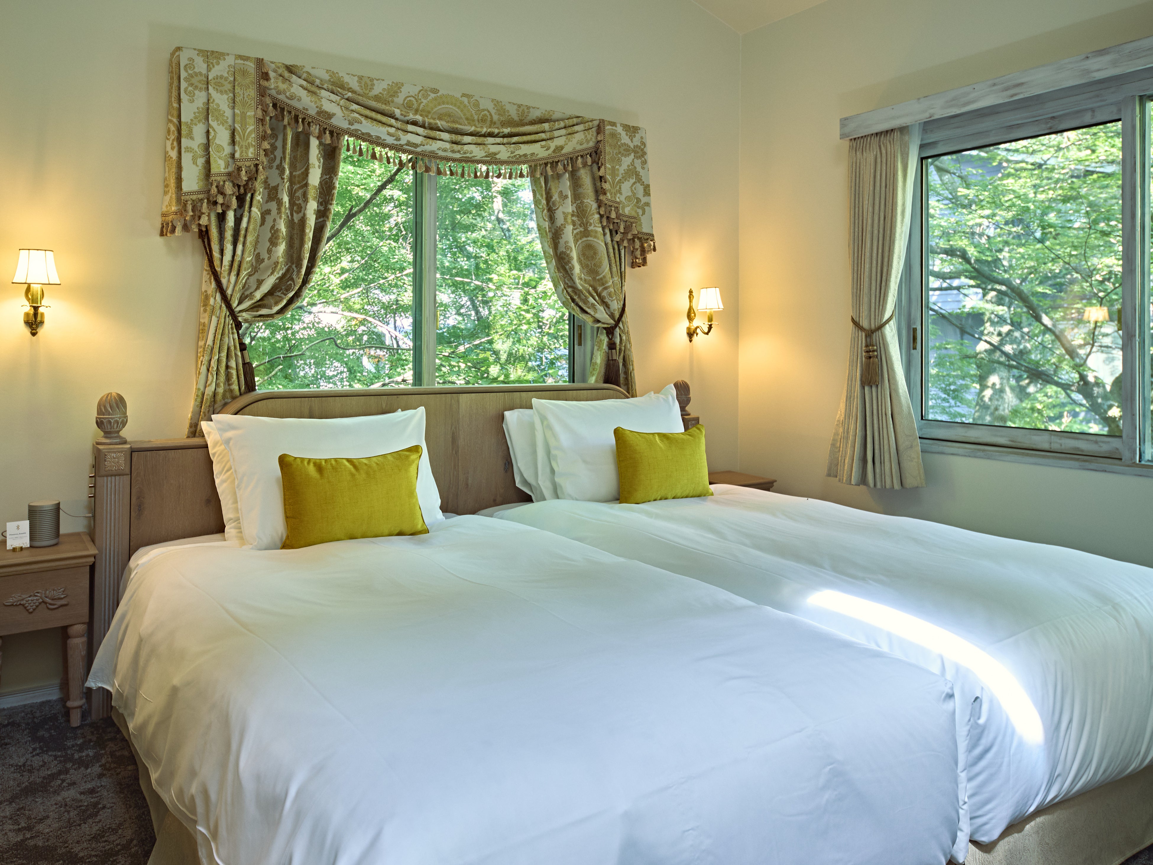 2025年8月にリニューアルオープンした宿泊棟はフランス・ボルドー地方のオーベルジュがコンセプト。パリの静かなアトリエやボルドー地方のブドウ畑を思わせる贅沢な空間づくりを目指しました。現地の20世紀初頭から中ごろのアンティーク照明、フランスのカーテンやリネン、20世紀を代表するアートを各所に設えました。