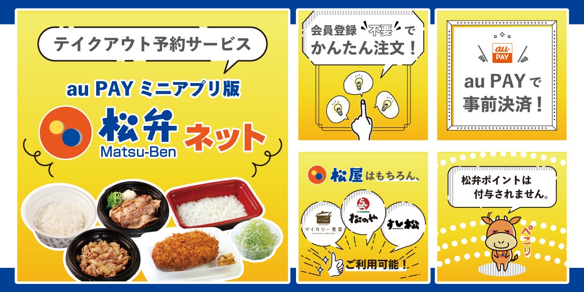 このたび松屋フーズ(本社:東京都武蔵野市、代表取締役社長:瓦葺一利)では、牛めし・カレー・定食・その他丼の「松屋」、とんかつ専門店の「松のや・松乃家」、その他ブランドにおきまして、QRコード決済サービス「au PAY」のアプリ内から、松屋お弁当WEB予約サイト「松弁ネット」のサービスが簡単に利用できる「松弁ネットミニアプリ」(注1)の提供を開始いたしましたのでお知らせいたします。
