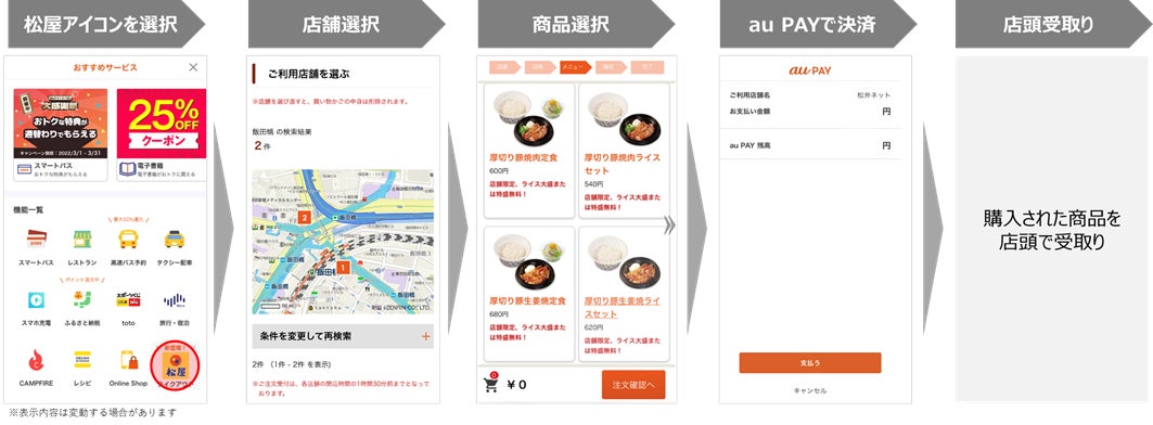 ※2 初回ご利用時に、au PAYに登録されているユーザー情報のうち、サービス利用に必要な情報を松屋フーズに提供することに同意いただいたユーザーがご利用いただけます。また、注文には、「松弁ネットミニアプリ」上で電話番号の入力が必要です。
