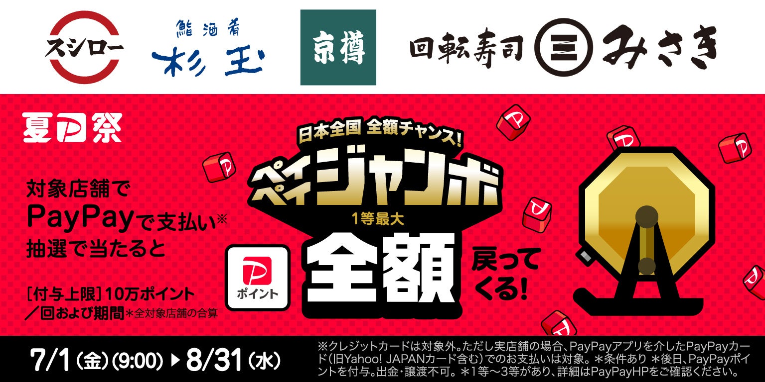 スシロー・杉玉・京樽・回転寿司みさき(※1)が対象(※2)に!PayPayポイントがお得に付与されるキャンペーン!7月1日(金)より『夏のPayPay祭』が開催!